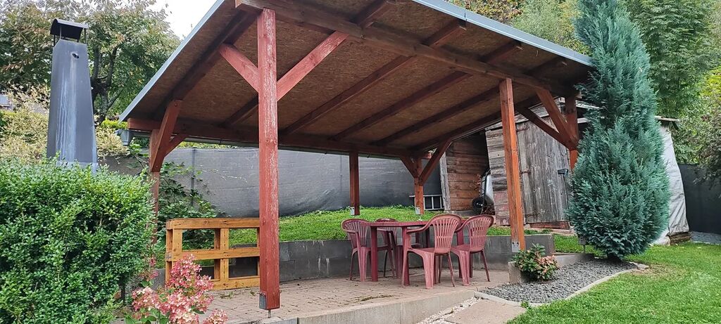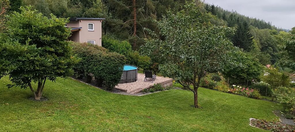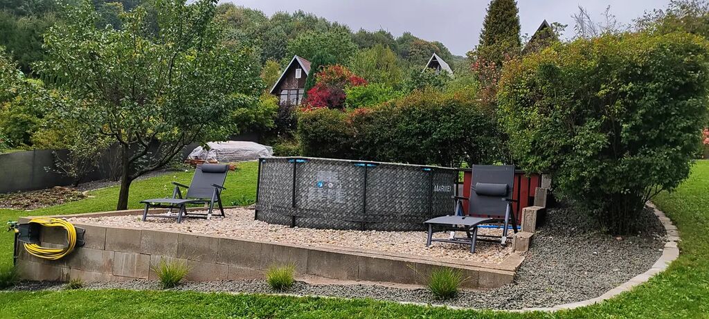 Rekreační objekt se nachází v zahrádkářské kolonii, najdete zde klid a soukromí. Pozemek je mírně svažitý a slunný, nechybí zde dřevěná pergola s grilem, skleník, nadzemní bazén, kůlna na nářadí a pískoviště pro děti.