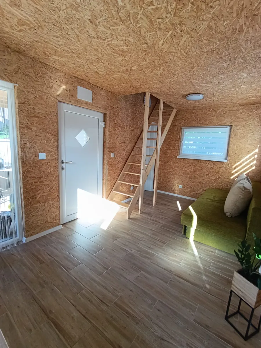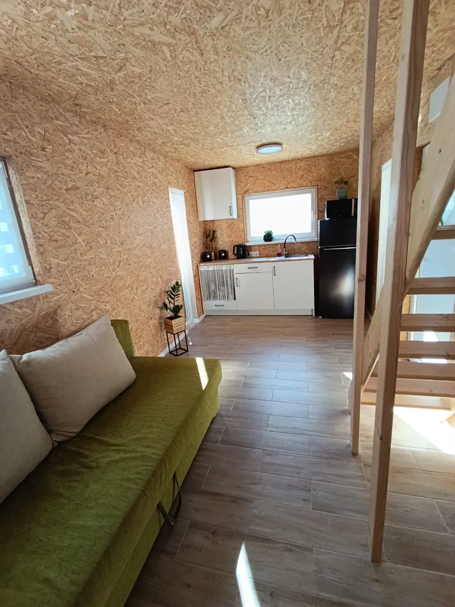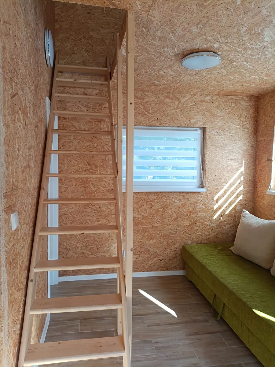 V přízemí chaty najdete kuchyňský a odpočinkový kout, koupelnu se sprchovým koutem a WC a dřevěné schodiště do patra. Tento prostor slouží ke spaní.