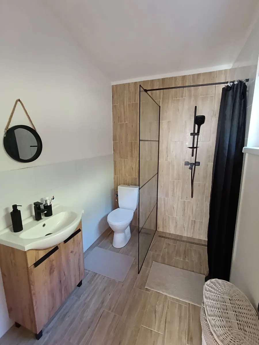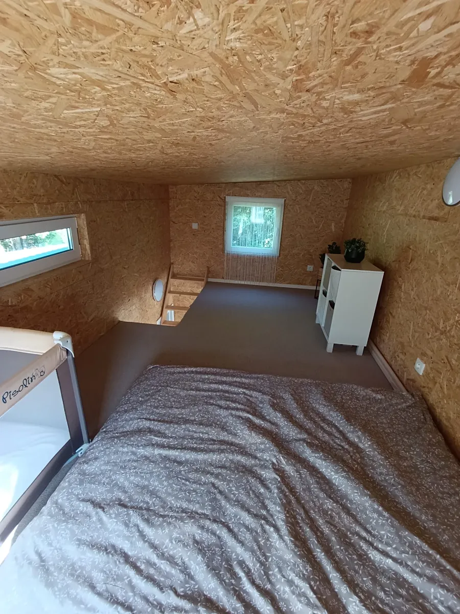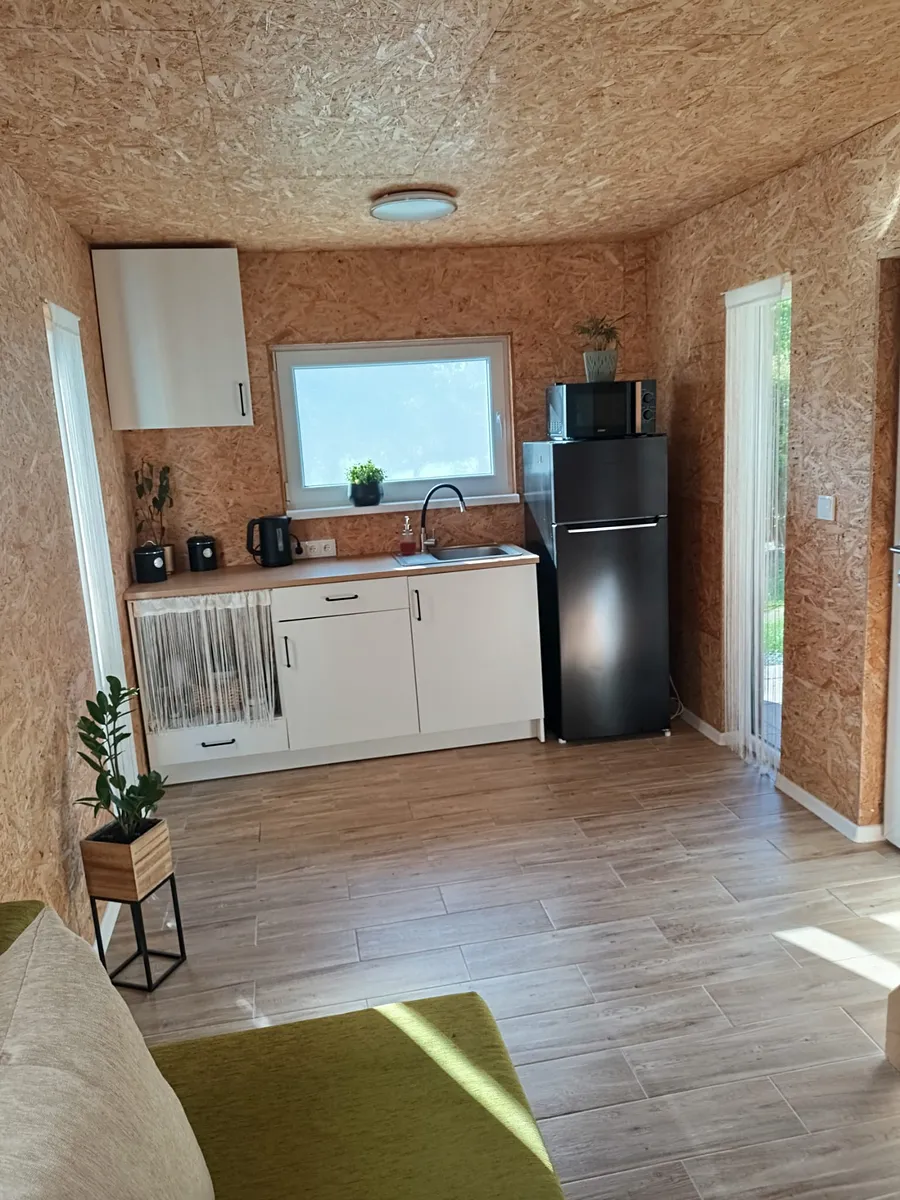 V přízemí chaty najdete kuchyňský a odpočinkový kout, koupelnu se sprchovým koutem a WC a dřevěné schodiště do patra. Tento prostor slouží ke spaní.