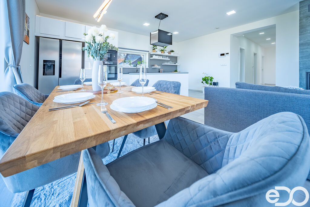 Z terasy a jídelní části domu se otevírá krásný výhled do přírody a na rozlehlou louku, což zajišťuje naprosté soukromí. A co je třešničkou na dortu? Nádherné západy slunce, které si můžete vychutnat nejen z terasy nebo od jídelního stolu, ale i z místa určeného pro vířivku. Luxus a romantika, které si zamilujete.