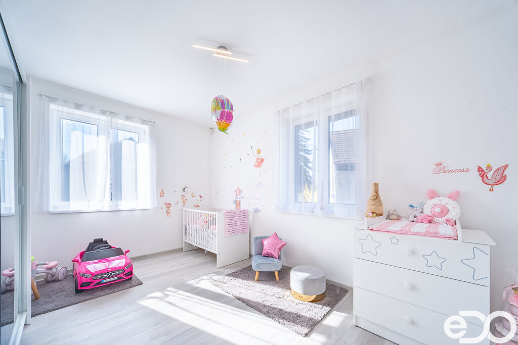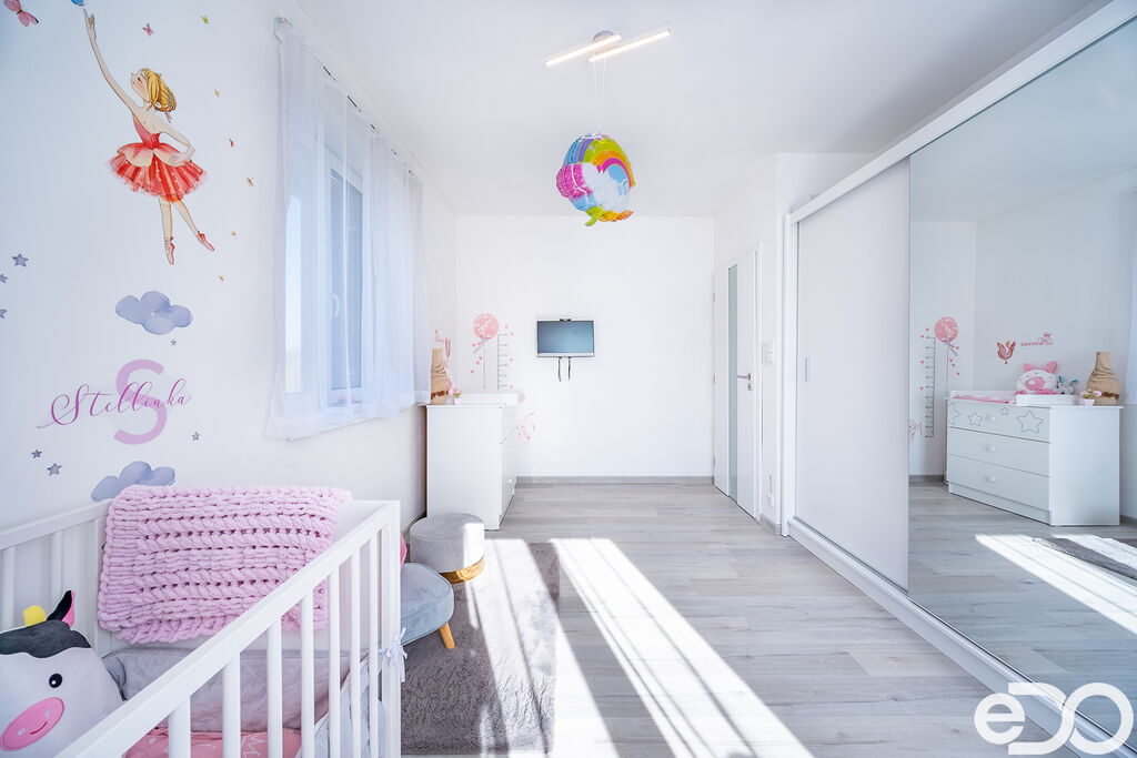 Všechna okna v domě jsou navíc vybavena žaluziemi na dálkové ovládání nebo ovládání přes mobilní aplikaci, pro maximální komfort. Celý objekt je chráněn kamerovým a zabezpečovacím systémem Jablotron.