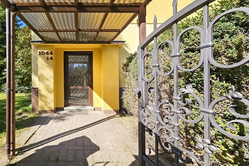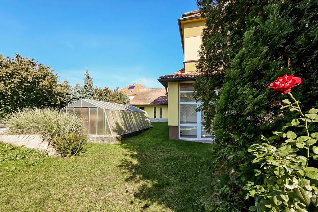 Na zahradě o ploše 640 m2 se nachází skleník a bazén (vyžadující renovaci), vzrostlé stromy a okrasné keře.
