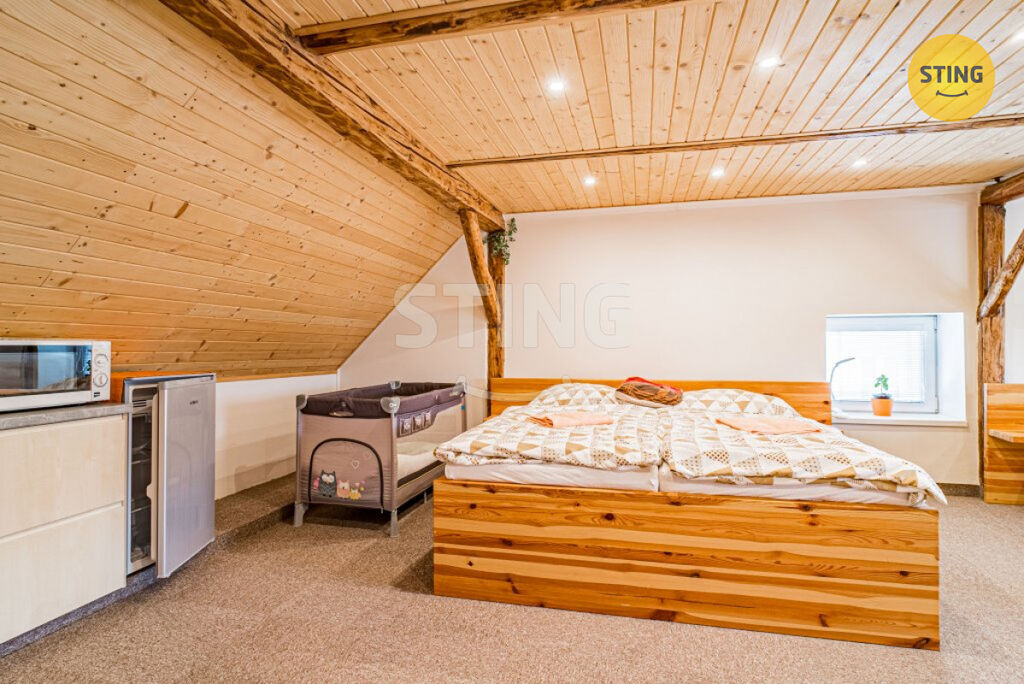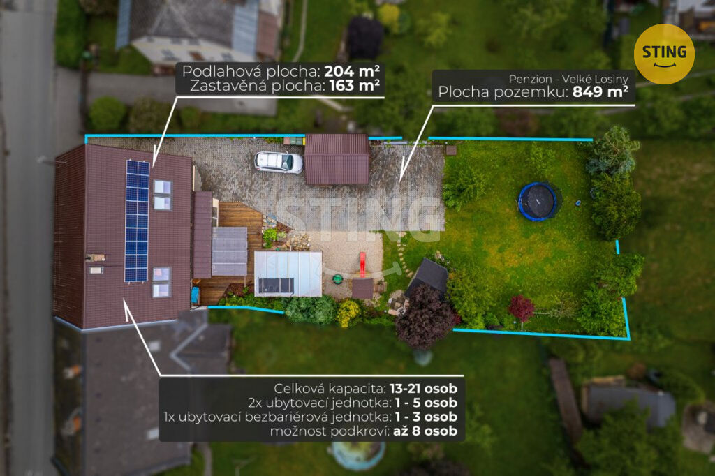 Penzion Velké Losiny u termálních lázní: 3 útulné byty včetně jednoho pro vozíčkáře, 13-21 lůžek pro celoroční relaxaci. Bazén, sauna, vířivka, masážní křeslo, pergola, grilovačka a parkování pro 4 vozy. Vybaveno rekuperací vzduchu, mobilní klimatizací, zabezpečením, a dokonce fotovoltaikou! Kompletně zrekonstruováno v roce 2021.
