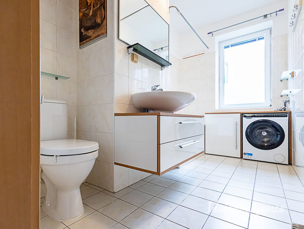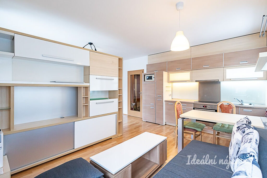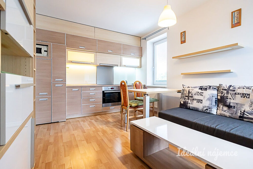Byt je nabízen plně vybavený, což ulehčí starosti s jeho zařizováním. Hlavní místnost je chytře řešená jako víceúčelový prostor – najdete zde kuchyňský kout, jídelní část i obývací zónu. Díky vestavěné policové stěně s množstvím úložných prostor je přirozeně oddělena také ložnicová část s postelí, takže byt působí vzdušně a útulně zároveň. Kuchyňský kout disponuje lednicí s mrazákem, varnou deskou, elektrickou a mikrovlnnou troubou, digestoří a jídelním stolem s židlemi. Obytná část je zařízena pohodlným gaučem a konferenčním stolem. Koupelna je vybavena vanou, umyvadlem, koupelnovou skříňkou, pračkou a WC.
