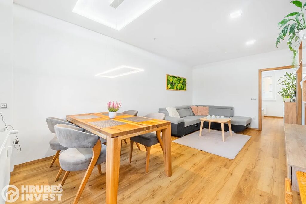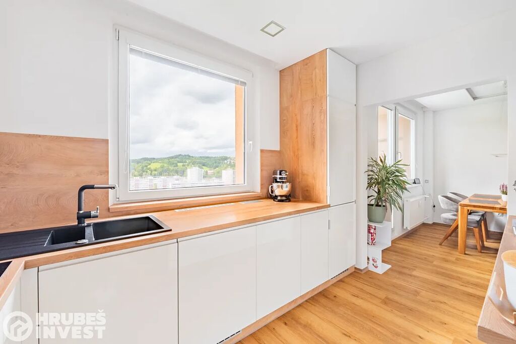 Byt o dispozici 3+kk se nachází v 5. nadzemním podlaží panelového domu s výtahem, který prošel kompletní rekonstrukcí v roce 2019. Tady je opravdu vše promyšlené do detailu – od vestavěných skříní, skryté komory až po elegantní koupelnu, kde najdete vanu i sprchový kout.