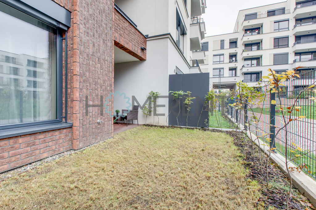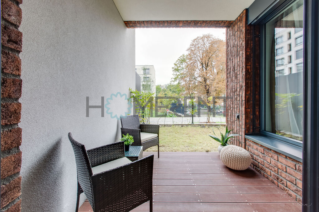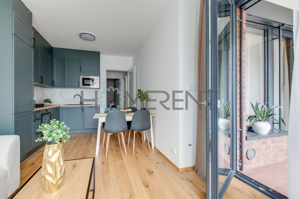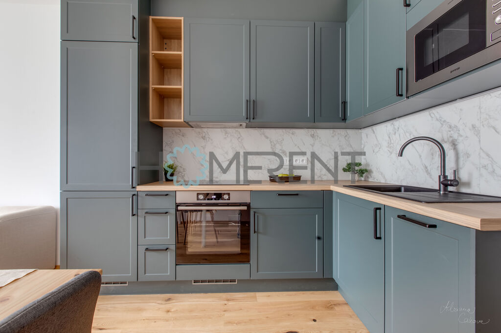 Byt vás přivítá prostorným obývacím pokojem s nádhernou černou matnou kuchyní s dřevěnou pracovní deskou a moderními černými spotřebiči. Kuchyň je plně vybavená a plynule propojená s obývací částí i jídelním koutem. Díky velkým oknům a přímému vstupu na čtyřmetrovou terasu a dvanáctimetrovou zahradu působí byt světlým a vzdušným dojmem.