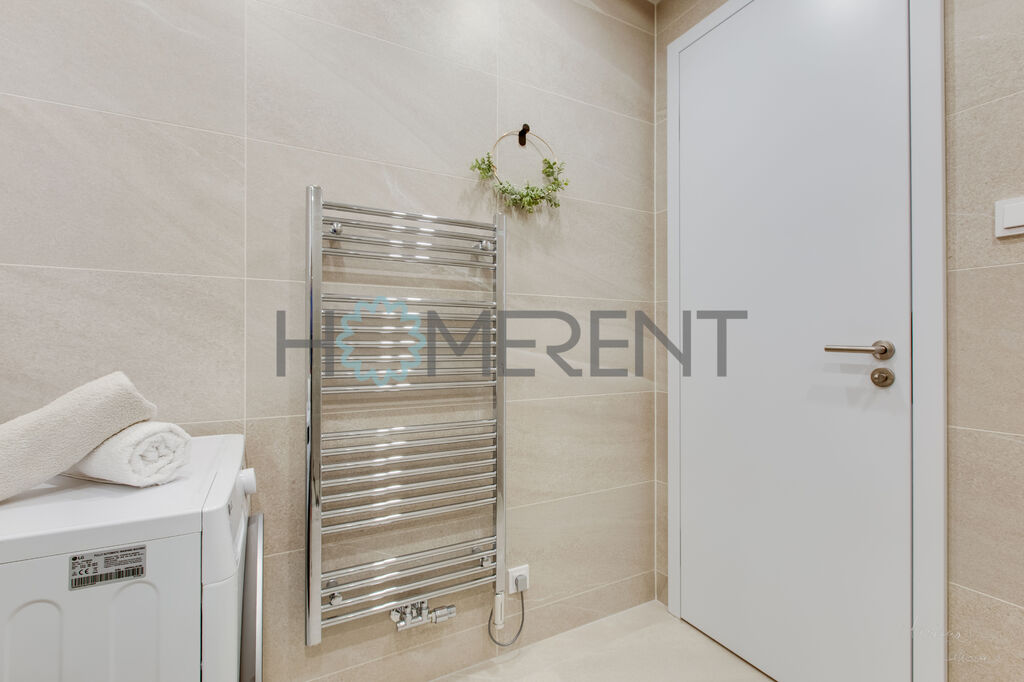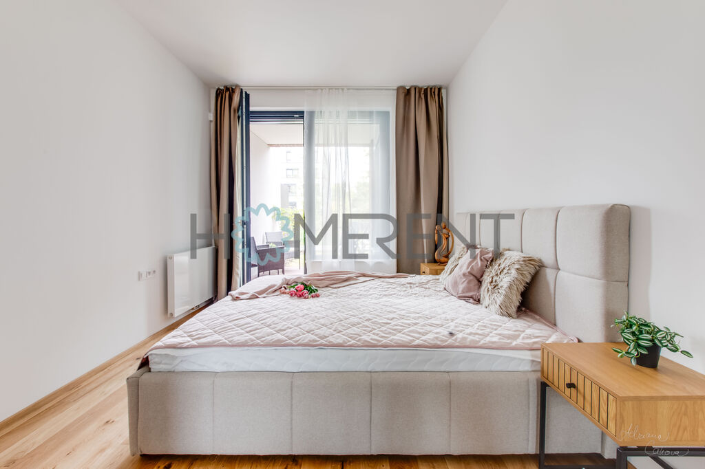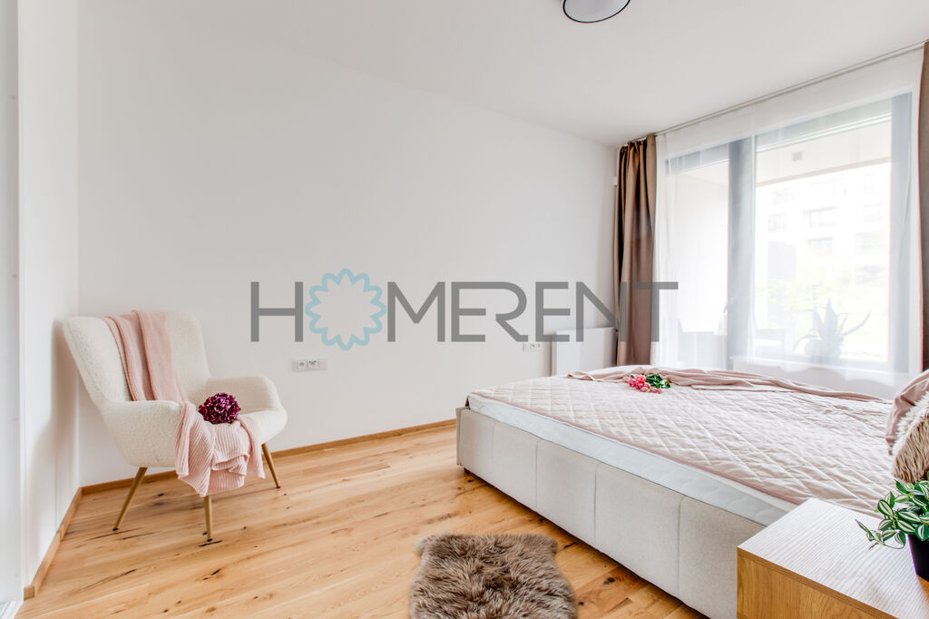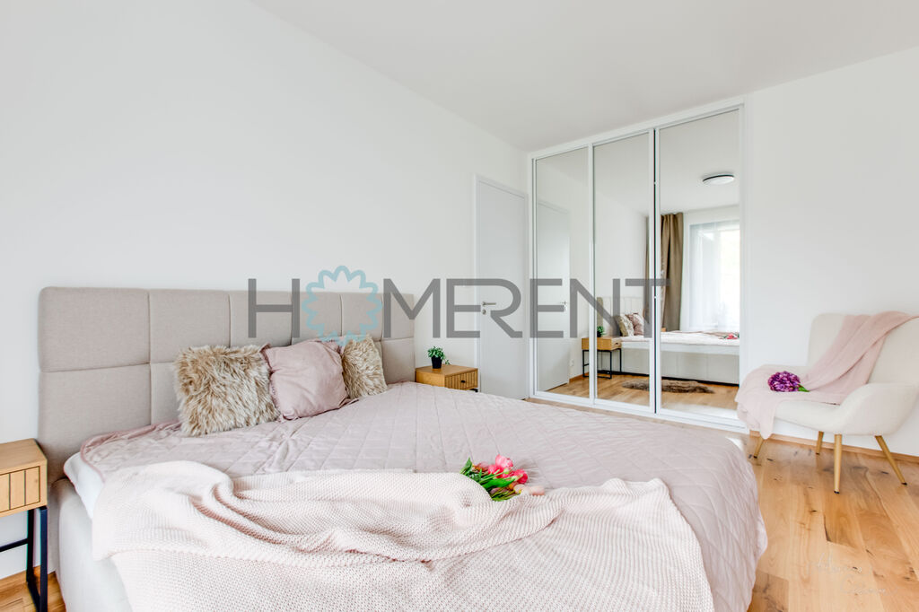 Ložnice nabízí dostatek úložného prostoru a pohodlný vstup na terasu, koupelna je vybavena prostorným sprchovým koutem a nechybí ani pračka se sušičkou. Další úložné kapacity najdete v praktických vestavěných skříních na chodbě.
