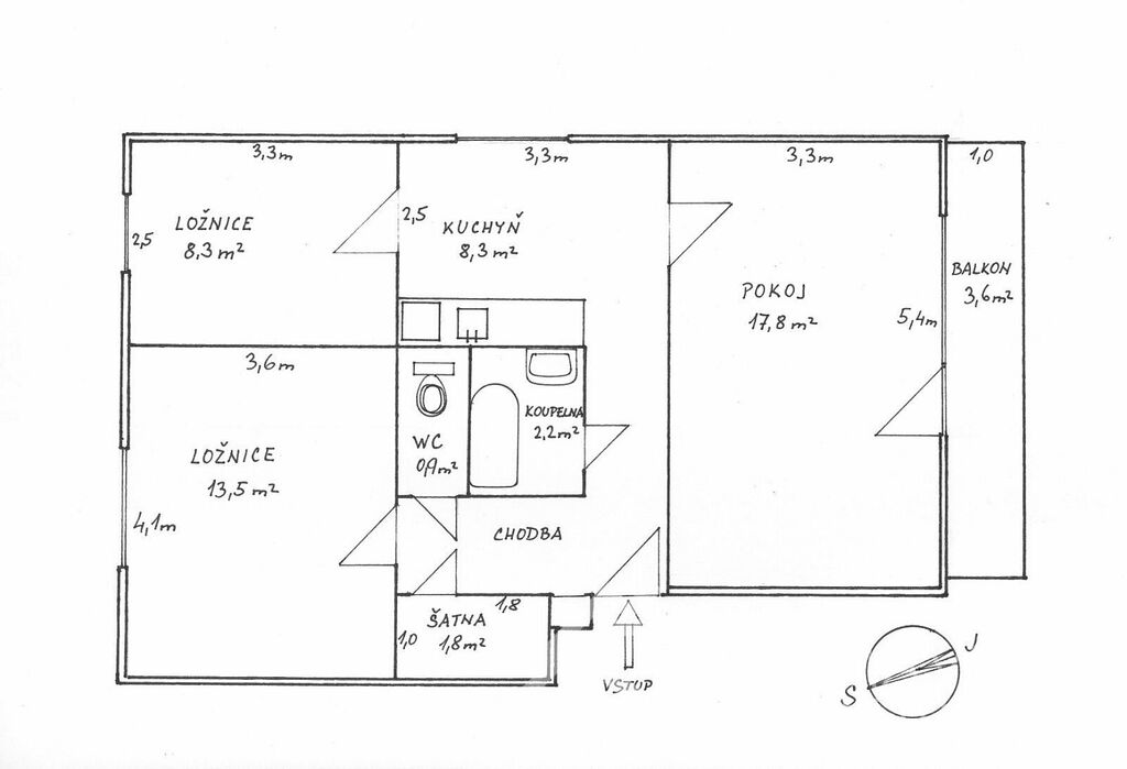 Popis bytu: nachází se ve druhém patře třípodlažního zděného cihlového domu s jen šesti byty. Bytový dům je situován v nejvýchodnější části Vimperku na konci ulice Špidrova. Výhodou nabízeného bytu je světlost a prosluněnost s širokým výhledem ze tří pokojů na všechny světové strany a okolní šumavskou přírodu. V bytě byla před rokem provedena rekonstrukce, při níž byly vyměněny okna za plastová, položeny nové podlahové krytiny z PVC. Nové jsou i sociální zařízení i část elektroinstalace. Po vstupu novými protipožárními dveřmi do bytu se ocitnete v prostorné předsíni ve tvaru L (5,8 m²), z níž vlevo je vstup do šatní skříně, komory (1,8 m²) s bojlerem a dále do jedné ložnice (13,5 m²). Na chodbě je ještě samostatné WC (0,9 m²) a koupelna s vanou (2,2 m²). Vstupní chodba vede dále do východní kuchyně (8,3 m²). Vlevo je jedna menší ložnice (8,3 m²) a vpravo jižní pokoj (17,6 m²) s prostorným balkonem (3,6 m²). K bytu je v suterénu rozměrný sklep (7,5 m²) a k dispozici jsou i další společné prostory – sušárny. Na katastru nemovitostí je byt již zapsán jako samostatná jednotka. Topení bylo nedávno předěláno na elektrické přímotopy, vodovod a kanalizace městské, elektřina 230 V.