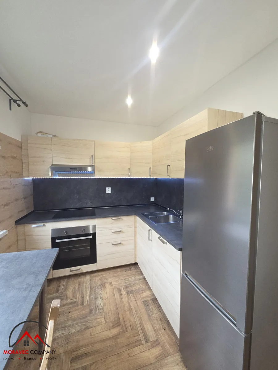Vybavení bytu zahrnuje moderní kuchyň s rohovou kuchyňskou linkou, jejíž součástí vestavěná trouba, indukční varná deska, digestoř a lednice a také stůl umístěný pod oknem.