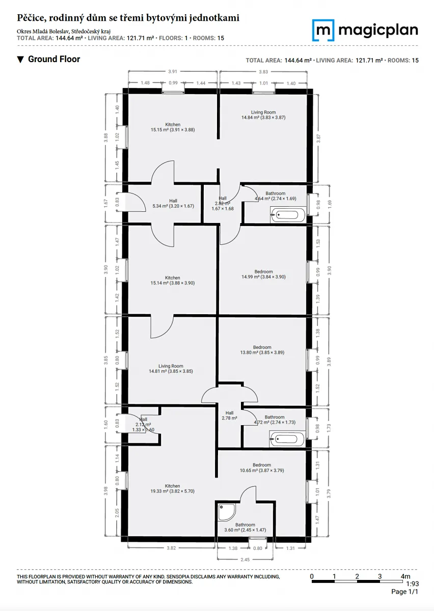 Součástí prodeje je i rodinný dům o zastavěné ploše 206 m2, ve kterém naleznete tři bytové jednotky. Dům je kompletně podřezaný, má hotové nové štukové omítky. Polovina domu má nové zateplení polystyrenem. Dům má plastová okna, plechovou střechu, nové rozvody elektřiny a je připojen na vodovod. Odpady jsou svedeny do vlastního septiku. Vytápění je řešeno krbovými kamny a v jednom z bytů navíc elektrokotlem. V bytech jsou nové koupelny a v bytě 1+1 je nová kuchyňská linka. Dvě bytové jednotky 1+1 a 2+1 jsou nyní prázdné a třetí jednotka je obsazena nájemníky.