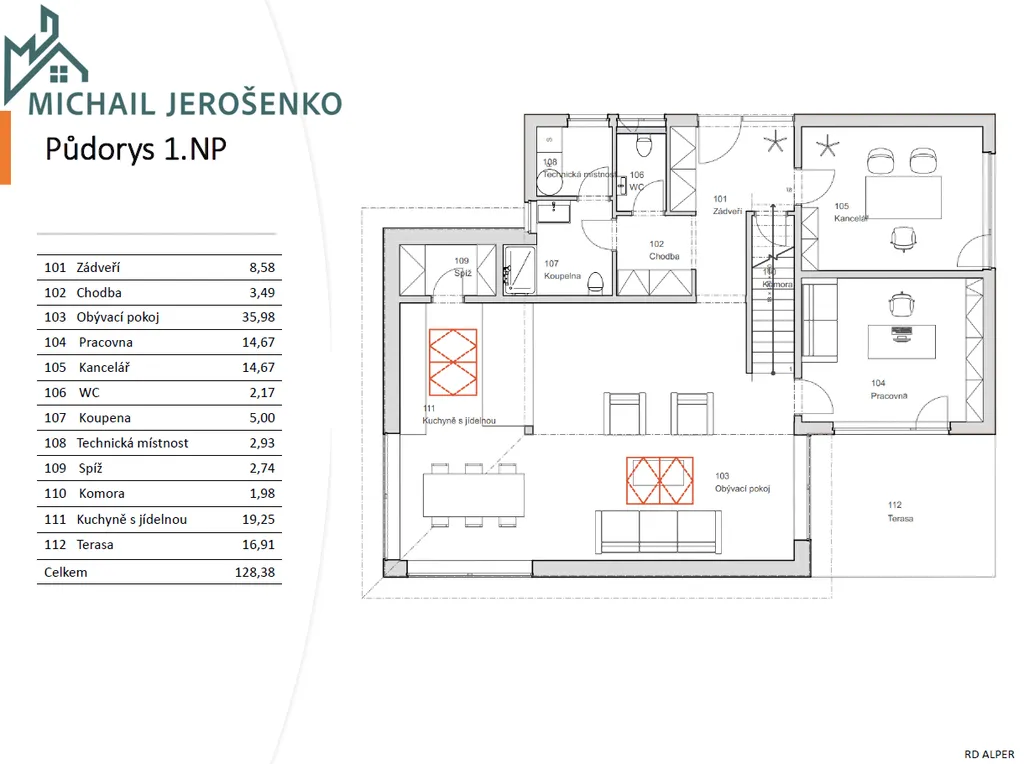 Přízemí: Vstupní zádveří s prostorem pro vestavěné skříně, koupelna s WC u vchodu, samostatná pracovna, pokoj pro hosty (či další ložnice) a velkorysý obytný prostor – kuchyň s ostrůvkem plynule navazuje na jídelnu a obývací část, se vstupem do zahrady.