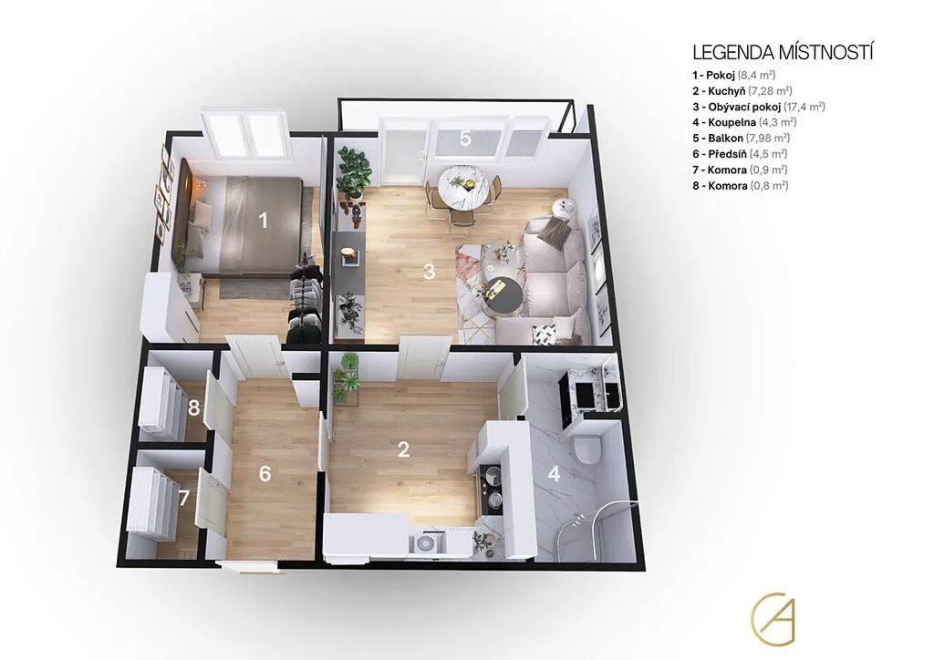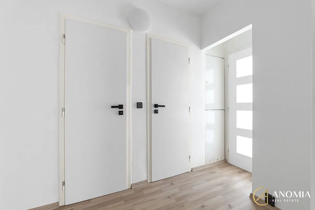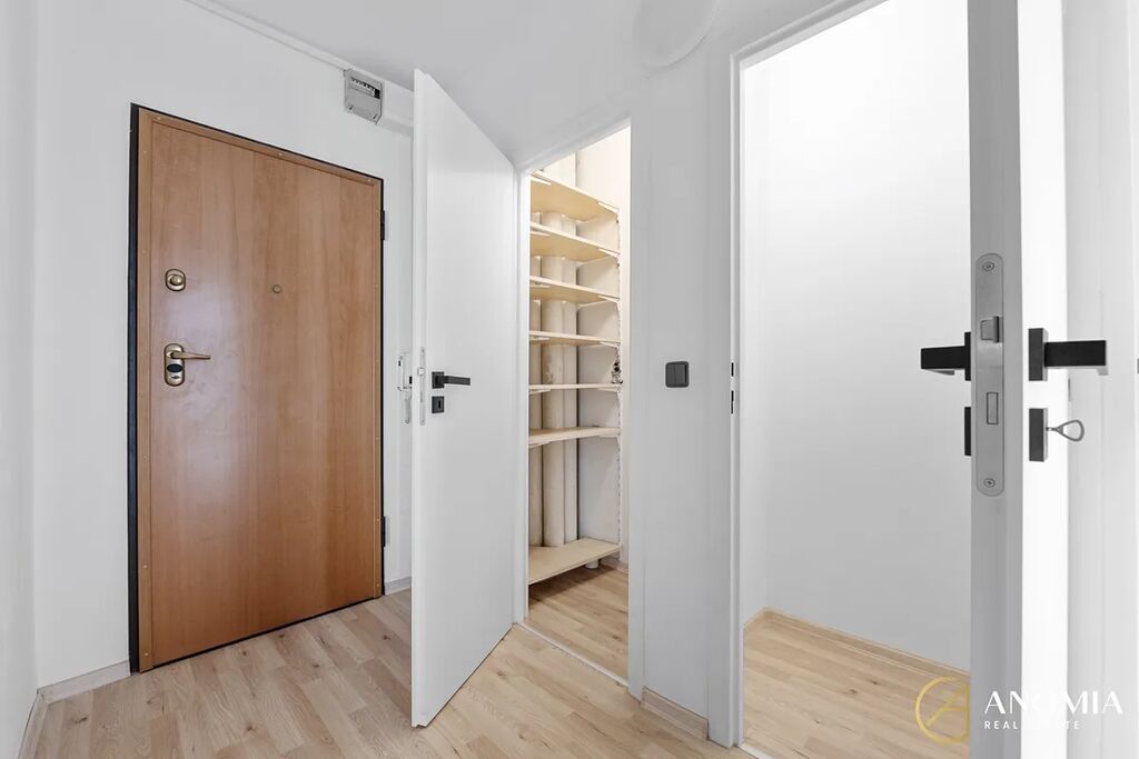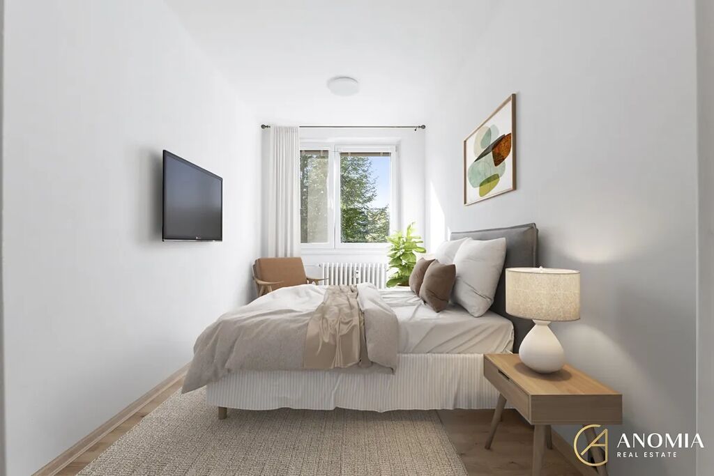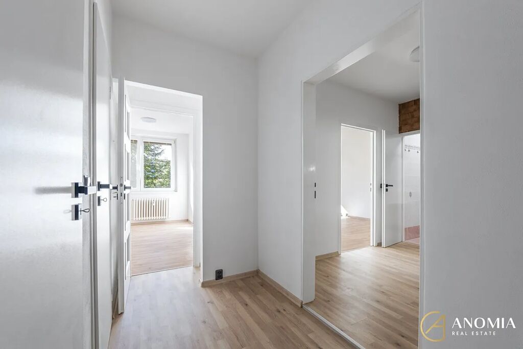 Interiér tvoří dva samostatné pokoje, kuchyně s podlahovým vytápěním, koupelna, chodba a dvě praktické komory poskytující dostatek úložného prostoru. Oba pokoje působí vzdušně a díky jižní orientaci a velkým oknům jsou krásně prosvětlené po celý den. Obývací pokoj navíc disponuje přímým vstupem na prostorný balkon s výhledem do klidného, zelení obklopeného vnitrobloku – ideální místo pro ranní kávu nebo večerní posezení.