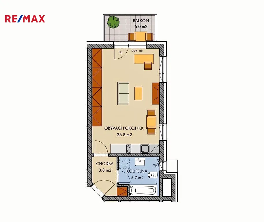 • dispozice: obývací pokoj s kuchyňským koutem a vstupem na balkon, předsíň, koupelna se sprchou, WC a přípojkou na pračku