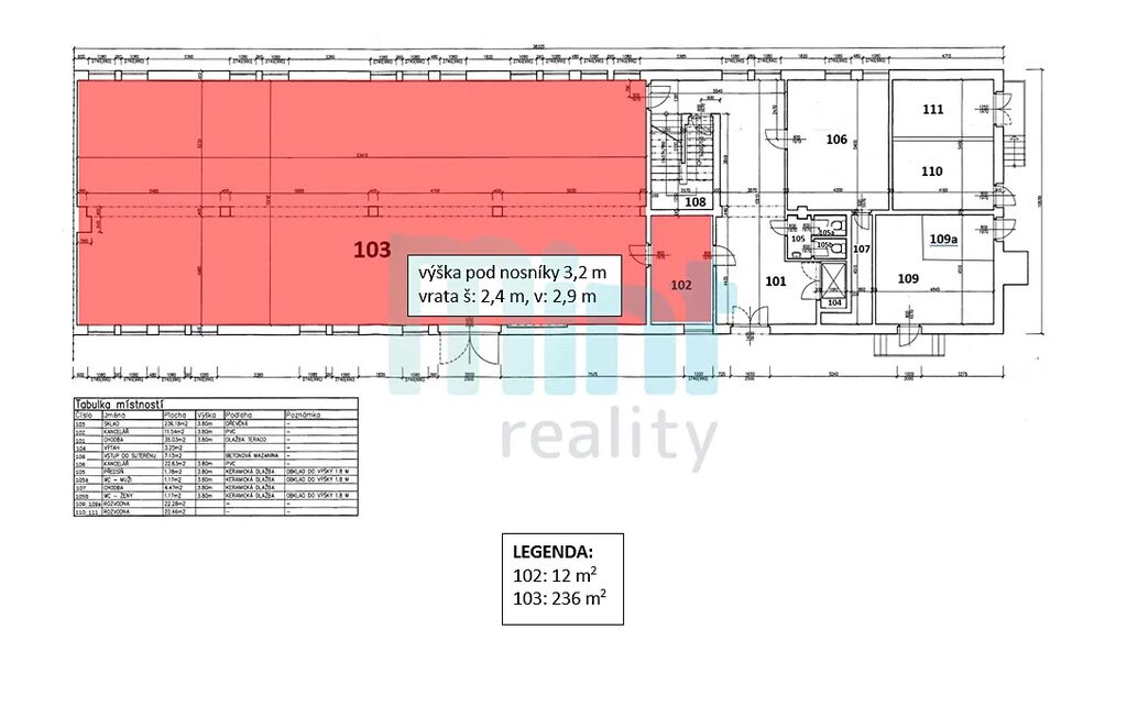 • Rozměry skladových prostor: výška pod nosníky 3,2 m; Vrata: šířka 2,4 m, výška 2,9 m.