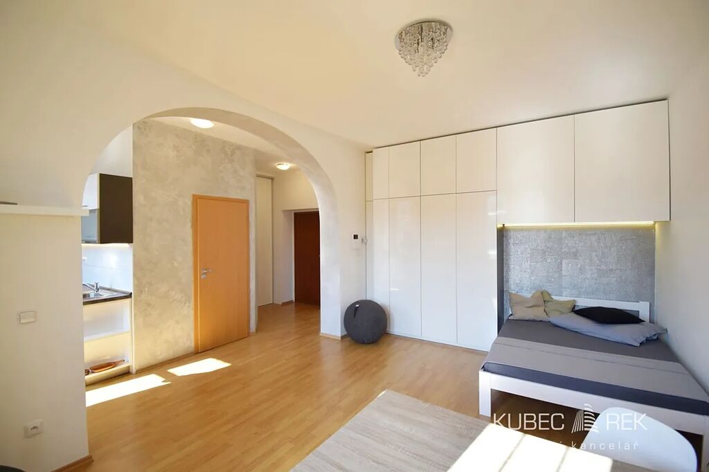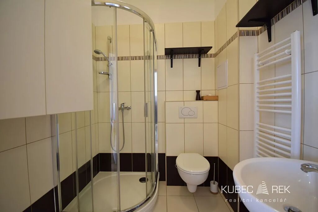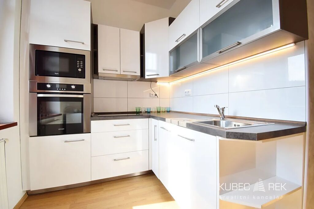 Byt zaujme příjemně oddělenou dispozicí – kuchyň s předsíní jsou částečně oddělené od světlého obytného prostoru, což vytváří pocit většího soukromí a pohodlí. Kuchyňská linka je plně vybavena moderními vestavnými spotřebiči: myčka, trouba, mikrovlnka, sklokeramická deska, digestoř i lednice. V koupelně je připraven prostor na pračku, dostatek úložných možností pak nabízejí vestavěné skříně v předsíni i obytné části. Další vybavení lze dohodnout.