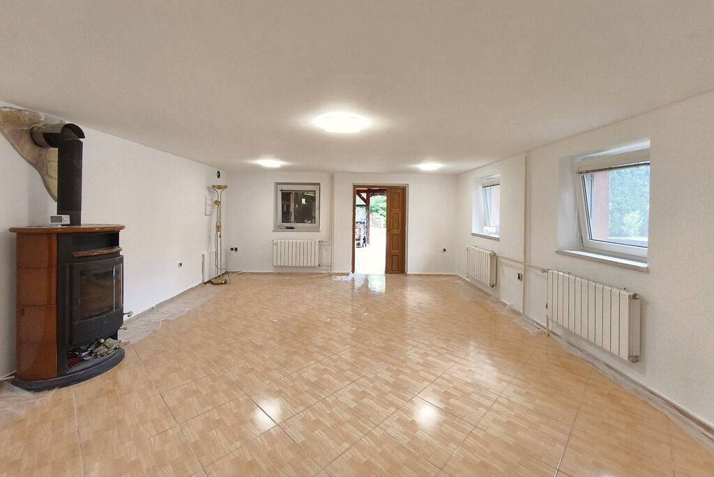 1. přízemí: prostorný obývací pokoj s krbem (37m²) a vstupem na pergolu, kompletně vybavenou kuchyní (13m²), technická místnost, kde se nachází plynový kotel a bojler pro ohřev vody (3,5m²), koupelna se sprchovým koutem (12m²), předsíň (5m²).