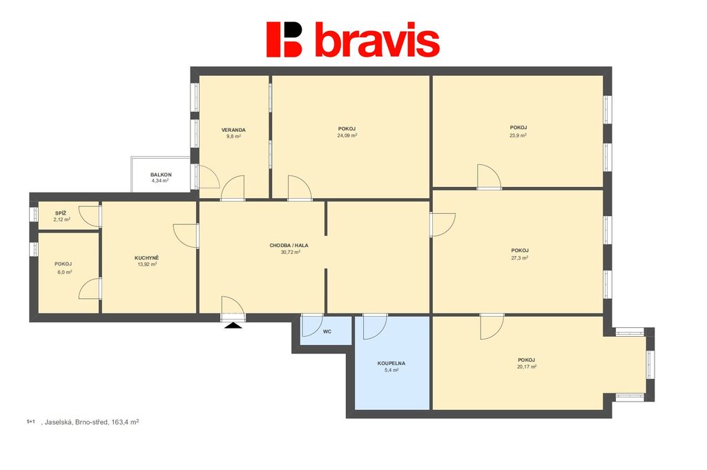 Po vstupu do bytu se ocitnete ve vstupní chodbě, ze které je přístupná kuchyně, zimní zahrada, jeden z pokojů, samostatná toaleta a také průchod z něhož se dostanete do koupelny a dalšího pokoje. Z tohoto pokoje vedou vstupy do dalších dvou samostatných pokojů, takže lze bydlení pohodlně uspořádat podle vlastních potřeb. Z kuchyně je možné vyjít na balkon orientovaný do klidného vnitrobloku, vstoupit do spíže a také do dalšího pokoje.