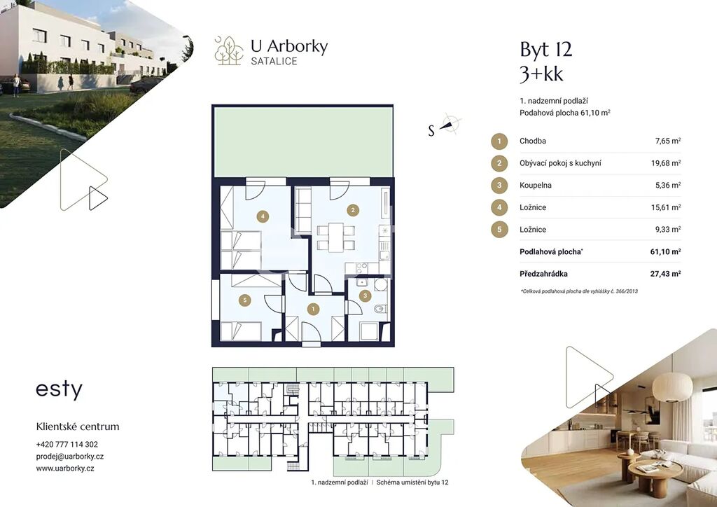 Tento byt se nachází ve 1. nadzemním podlaží a nabízí dispozici 3+kk s celkovou plochou 61,1 m²: