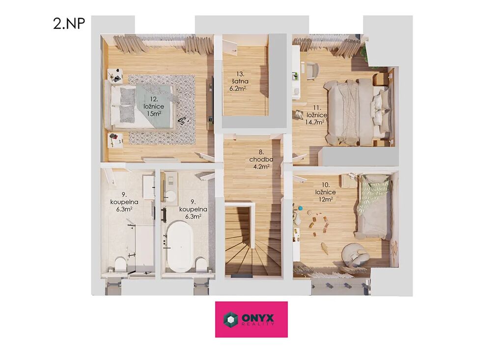 Bytová jednotka má vlastní vstup, dvě parkovací stání, dvě podlaží s částečné šikmou střechou a přímý vstupem z obývacího pokuje na terasu se zahradou. Praktické dispoziční řešení nabízí prostorný obývací pokoj s kuchyní, tři samostatné ložnice, dvě koupelny, technickou místnost i dostatek úložných prostor.