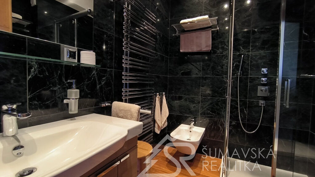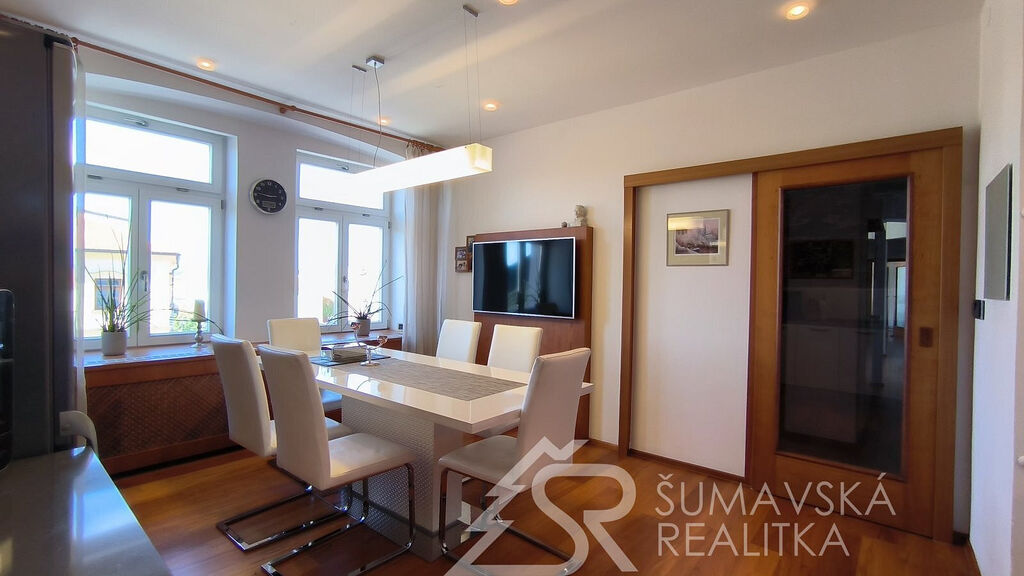Přímo na gotickém náměstí v Kašperských Horách se nachází zrekonstruovaný dům v jehož 2. NP je nabízený apartmán o podlahové ploše 120 m², který vznikl spojením dvou sousedních bytů. Nádherný výhled na námětí s kostelem sv. Markéty a radnicí je opravdu nezapomenutelný a neokoukatelný. Byt prošel kompletní modernizací v roce 2020, je nadčasově designově zařízen a v tomto stavu se také prodává. V prostorné předsíni jsou velkorysé vestavěné zrcadlové skříně a vstupy dveřmi z masivu do třech ložnic, obývacího pokoje, kuchyně s jídelnou a dvou koupelen s mramorovým obkladem. Ve větší ložnici je umístěna i infrasauna. Na jedné stěně v kuchyni je zachovalé původní kamenné zdivo, které dodává místnosti punc historie. Vybavení však hovoří o moderní době, kdy zařizovací předměty jsou od firmy Siemens (sklokeramický sporák, vestavěná trouba, digestoř) a myčka Bosch. Krásné jsou i dřevěné kryty radiátorů a velkoformátové dřevěné parkety z teaku v obytných místnostech. Veškerý nábytek byl tvořen na míru. V jedné z koupelen je vířivá vana a bidet. K bytu jsou k dispozici na chodbě dvě samostatné praktické komory a ve vnitřním dvoře parkovací stání.