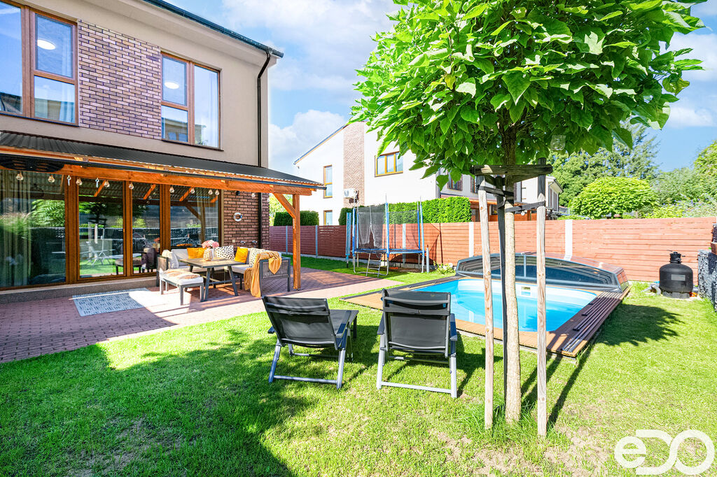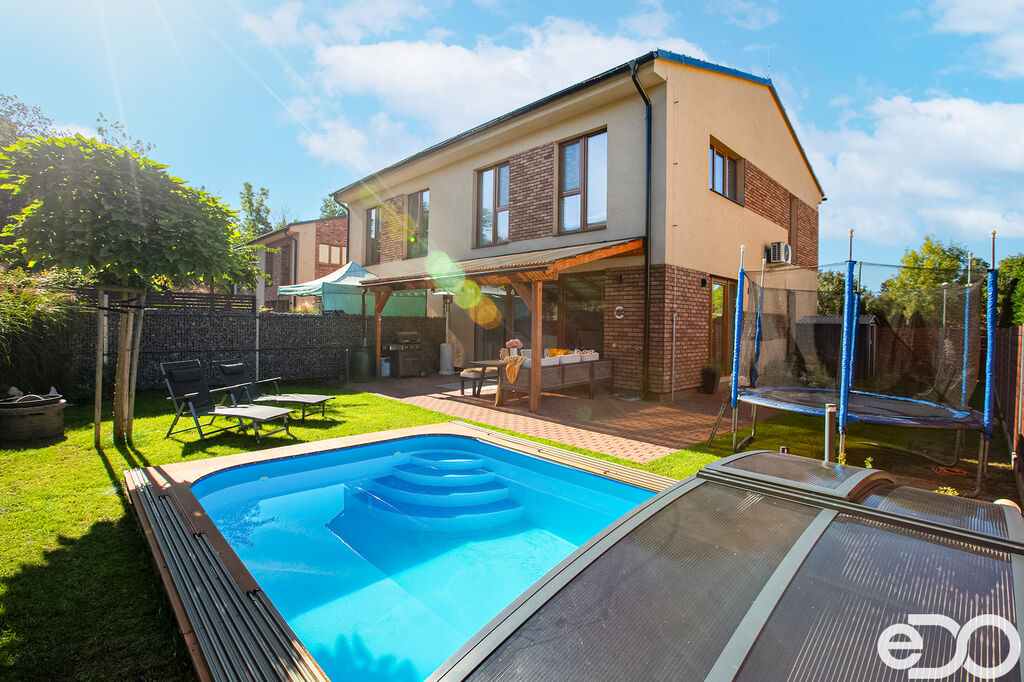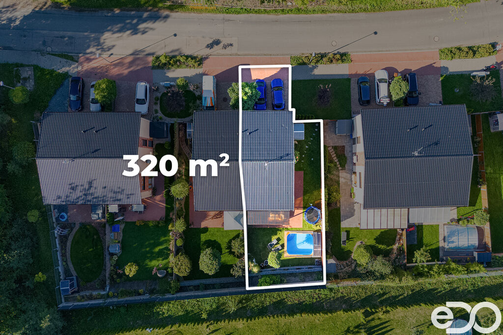 Nemovitost stojí na pozemku o výměře 320 m², který nabízí dostatek prostoru pro relaxaci, Z obývacího pokoje je řešen vstup do pergoly a následně na zahradu o výměře cca 200 m2, jejiž prostor zajistí dostatek klidu i využití pro děti. Příslušenstvím je bazén 3x4 m s krytím a pískovou filtracím. Před domem (pozemek patří k domu) je možnost pohodlného parkování pro dvě vozidla. Samozřejmostí je napojení na veškeré sítě.