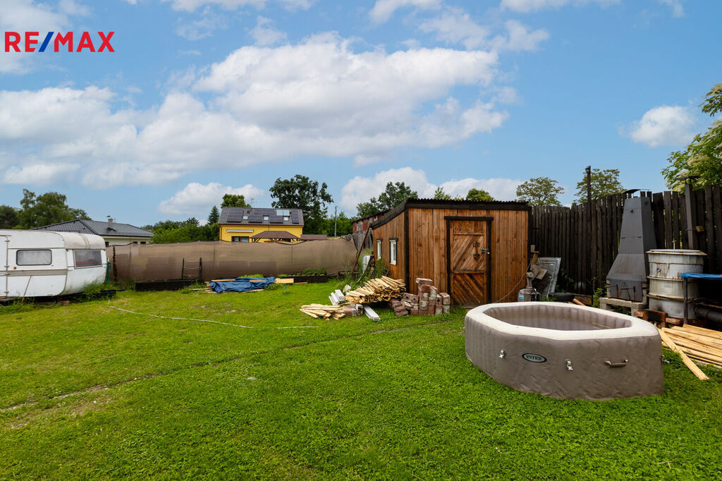 - Dřevěná kůlna využívaná především na uskladnění zahradního náčiní s přistavenou retenční nádobou na zachytávání dešťové vody,