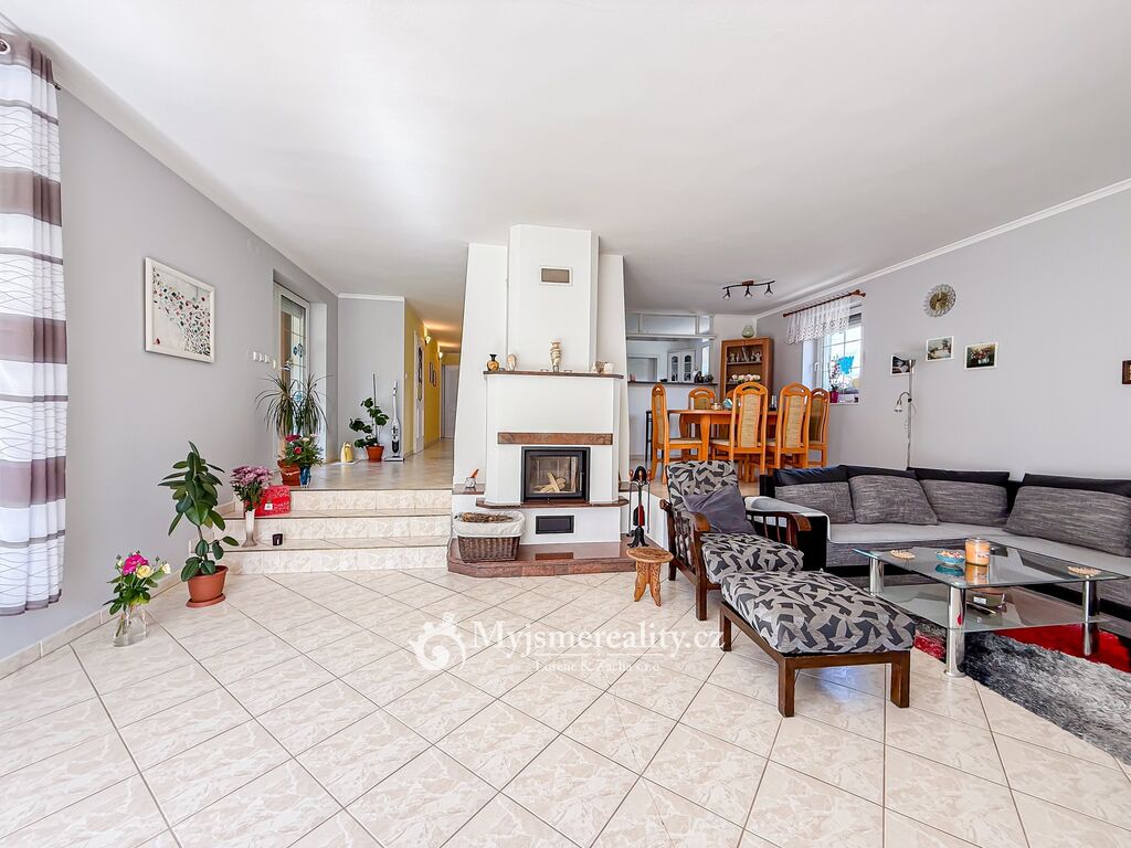 V přízemí je menší zádveří a vstupní hala se schodištěm, technická místnost (pračka, sušička a kotel), koupelna s rohovou vanou, sprchovým koutem a wc s bidetem. Dvě ložnice a pak dominanta tohoto domu, což je plně vybavené a zařízená kuchyň s vlastní špajzkou, barem a jídelní částí na níž navazuje prostorný obývací pokoj s krbem a zimní prosklená zahrada a vstup na zastřešenou terasu s posezením.