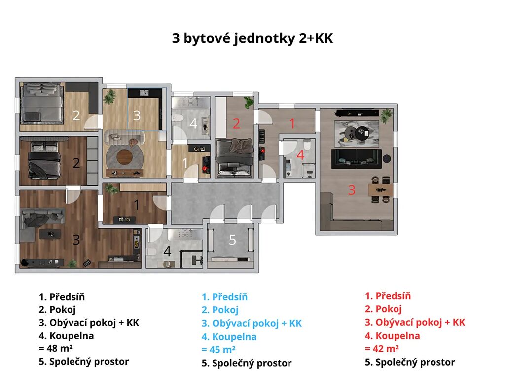 První patro nabízí dvě bytové jednotky o celkové ploše 157 m². Díky chytrému dispozičnímu řešení je možné prostor rozdělit až na tři samostatné byty 2+kk, což je dnes nejžádanější a nejprodávanější typ bytových jednotek na trhu. Velkorysý půdní prostor navíc umožňuje vybudování dalších tří bytů 2+kk. Celkem tak může vzniknout až šest bytů této dispozice v kombinaci s obchodními prostory v přízemí. Dispozice 2+kk jsou nejoblíbenější a nejprodávanější jednotkou – ideální pro stabilní výnos.