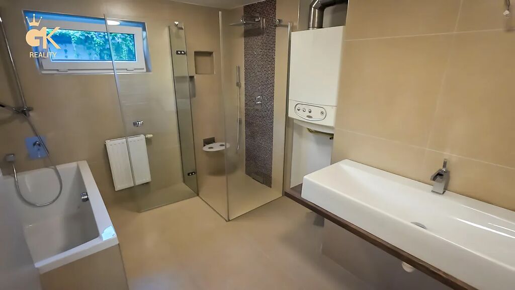 • Spodní byt 3+kk (88 m²) prošel kompletní rekonstrukcí. Moderní kuchyňská linka na míru se spotřebiči (bez lednice), kvalitní pojezdy Blum, luxusní koupelna s vanou a bezbariérovým sprchovým koutem, podlahové vytápění, vinylové podlahy a velká okna dodávají bytu nadčasový charakter. Ložnice nabízí niky na vestavěné skříně, z nichž by se po úpravě dalo vyjít přímo na zahrádku. Tento byt je ideální pro bydlení i podnikání.