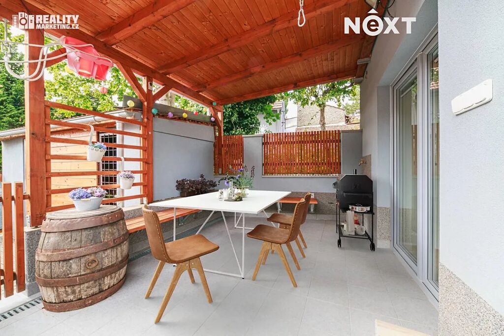 Z příslušenství k domu můžeme zmínit terasu vhodnou k relaxaci či posezení s přáteli, sklep o velikosti 6,8 m2, dřevník a šopu či menší dílnu. Na pozemek je přístup i ze zadní části.