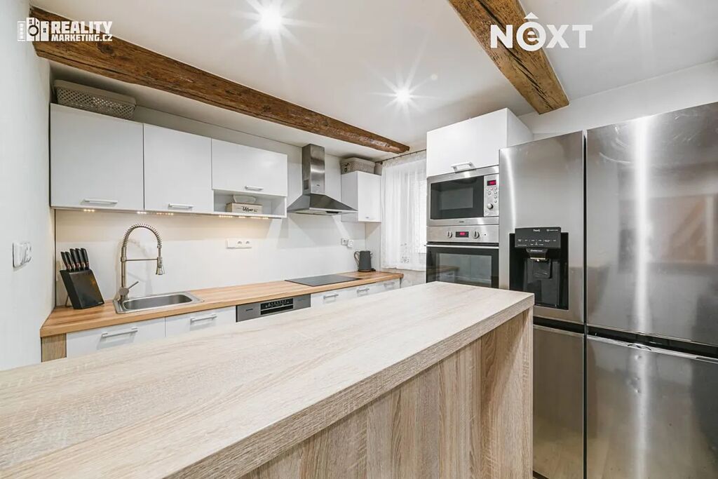 K vytápění domu slouží elektrické podlahové vytápění v kombinaci s přímotopy, v obývacím pokoji jsou pak krbová kamna, která Vám mohou zpříjemnit atmosféru nejen v chladnějších měsících. Ohřev vody zajišťuje elektrický bojler. Z vybavení kromě zmíněných krbových kamen zůstává kuchyňská linka se značkovými spotřebiči – indukční varná deska, digestoř, pečící trouba, mikrovlnná trouba, myčka.