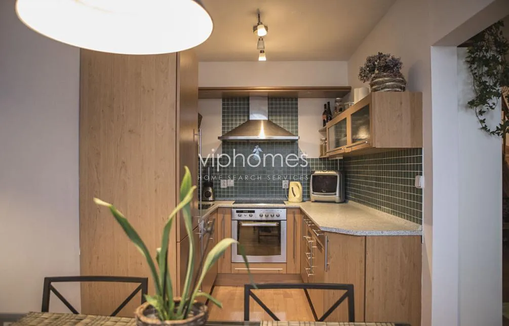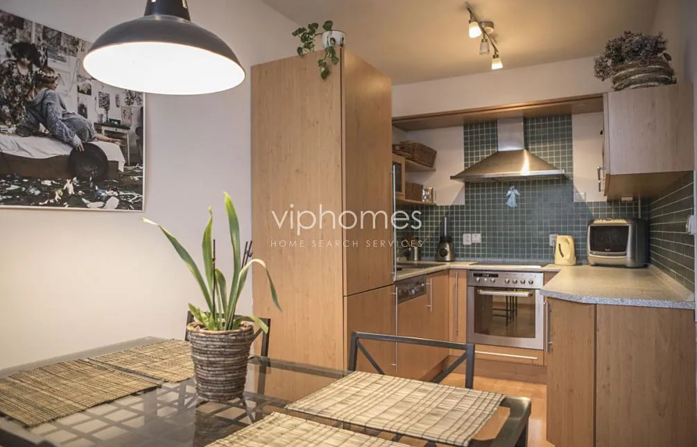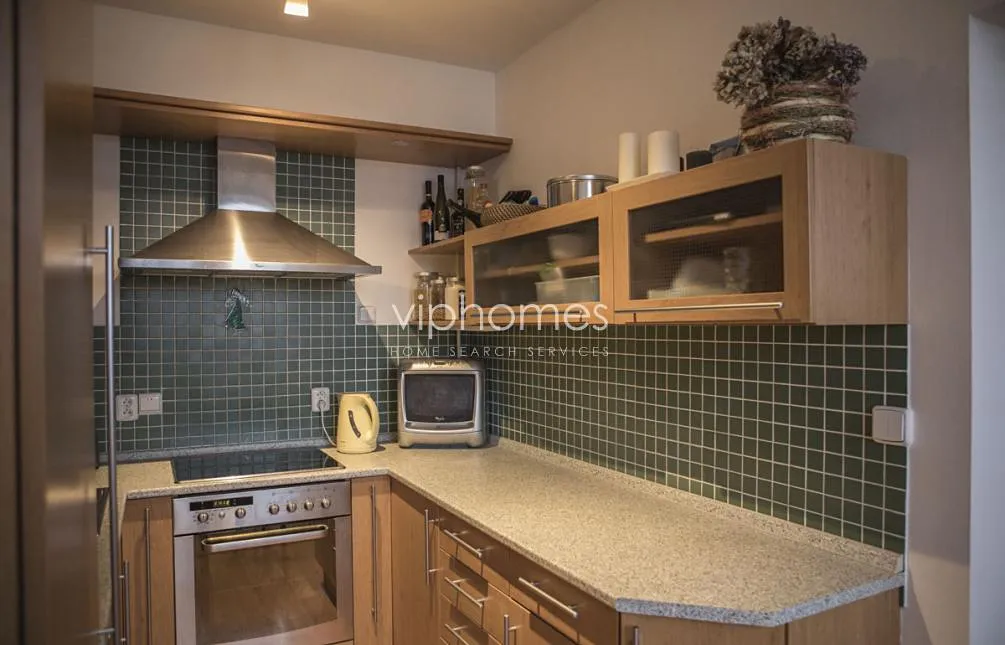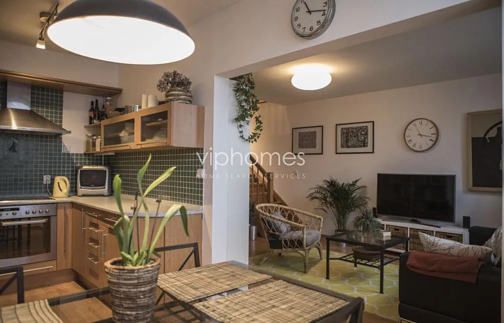 Byt tvoří vstupní hala, obývací pokoj s plně vybaveným kuchyňským koutem, (myčka, elektrická keramická deska, lednice s mrazákem), toaleta; v patře je ložnice, koupelna s vanou, umyvadlem a toaletou. K bytu náleží sklepní kóje 4 m2.