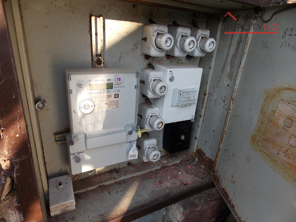 Voda obecní je na pozemku. Vodoměr v šachtě v zemi. V chatě je zavedena elektřina s elektroměrem.