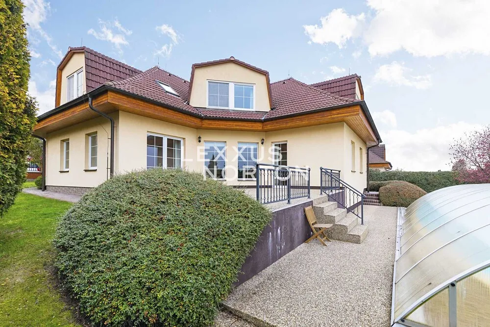 V přízemí domu se nachází vstupní hala, prostorný obývací pokoj se vstupem na terasu (36 m2) a zahradu, samostatná plně vybavená kuchyň (sklokeramická deska, lednice, mrazák, trouba, mikrovlnná trouba a myčka nádobí) včetně jídelního prostoru, pracovna, technické zázemí a garáž pro 2 vozidla. Horní patro dispozičně nabízí 4 ložnice, z nichž dvě mají přístup na vlastní balkon, šatnu a 2 koupelny disponující vanou či sprchovým koutem. V suterénu je prádelna, kotelna, herna / fitness a vstup do garáže. Součástí vybavení nemovitosti je alarm s možností napojení na bezpečnostní agenturu, vestavěné skříně, půdní úložný prostor, satelitní TV připojení. K nemovitosti náleží vyhřívaný krytý bazén, nádherně udržovaná zahrada a garáž pro 2 vozidla.