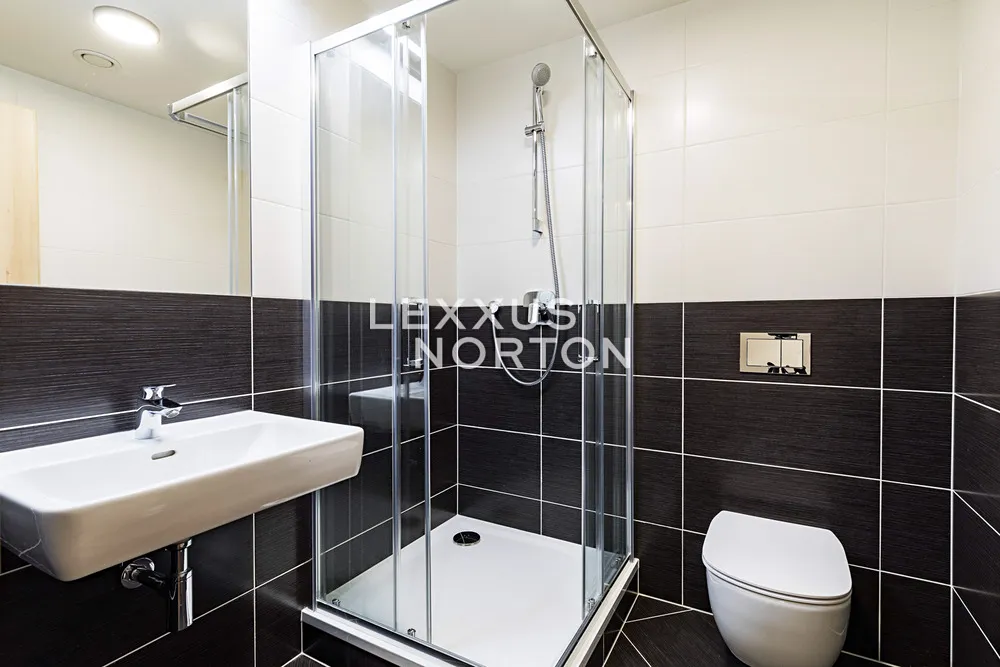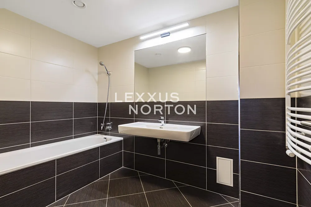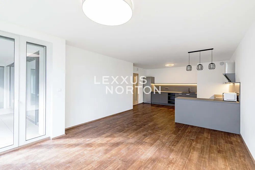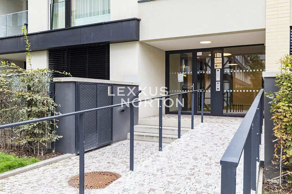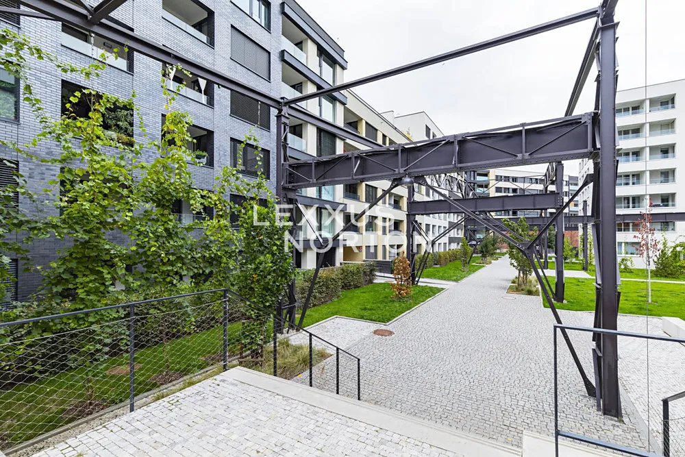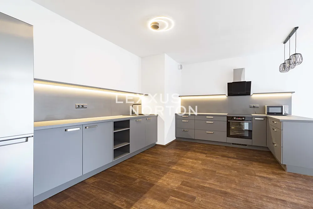 Tento světlý nezařízený byt k pronájmu nabízí k užívání vstupní chodbu, prostorný obývací pokoj, plně vybavený kuchyňský kout (sklokeramická deska, trouba, lednice, mrazák, mikrovlnná trouba a myčka nádobí), hlavní ložnici s vlastní koupelnou, další dvě ložnice, koupelnu, samostatnou toaletu a komoru. K bytu náleží lodžie s předzahrádkou s výhledem do vnitrobloku, garážové parkovací stání které je vybaveno automatickým otevíráním díky naskenování poznávací značky a sklep. Bytový areál je uzavřený pro veřejnost. Ve vnitrobloku je také fitness, kavárna, prádelna, potraviny, výdejní boxy obchodu Alza a výdejní boxy české logistické platformy v Čechách, Zásilkovna.