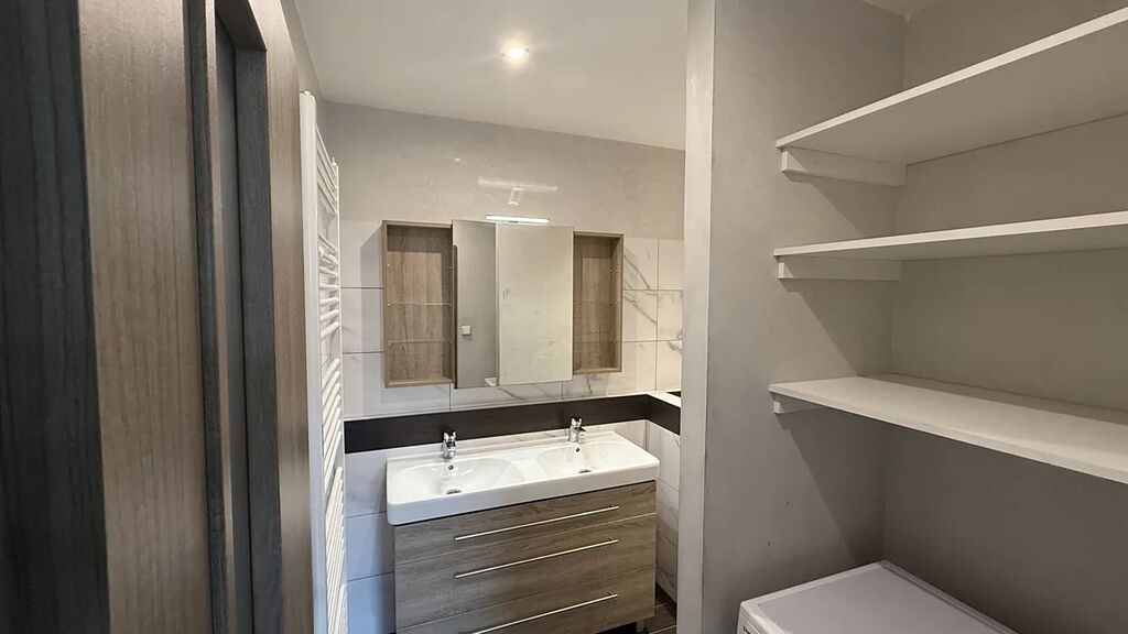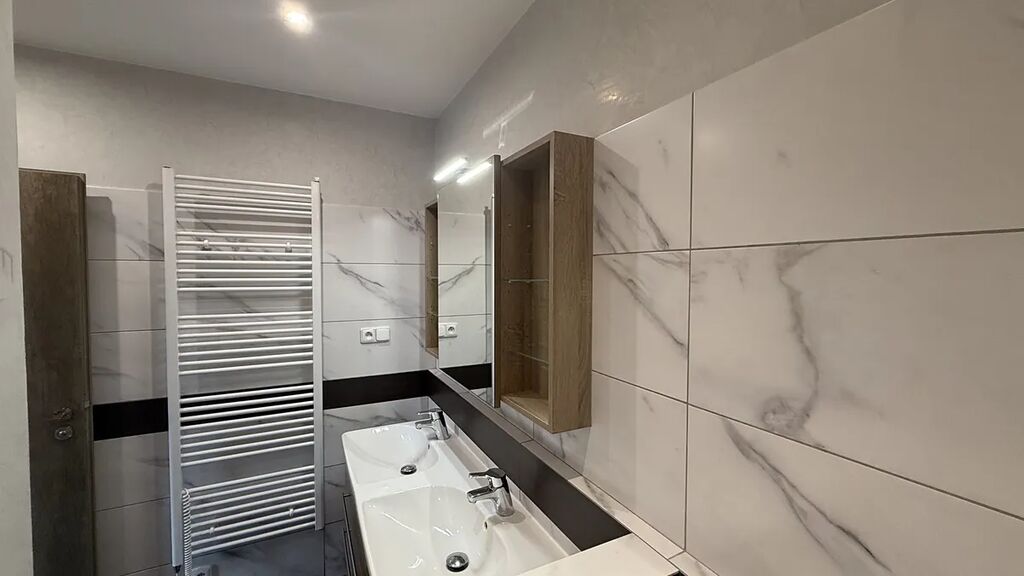 Na podlahách jsou keramické dlažby a v pokojích, kuchyni a jídelně pak vinylové krytiny. Dřevěné obložky a dřevěné dveře pak jen podtrhují velmi příjemný pocit z celého prostoru bytu. Všude jsou moderní úsporná LED svítidla.