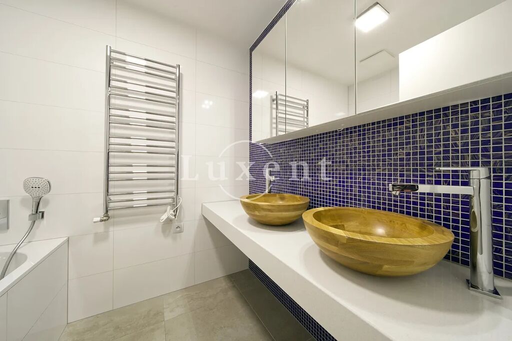 Samotný byt má podlahovou plochu 168 m2 a skládá se z hlavní obývací místnosti (kuchyňského koutu, jídelní zóny a obývací zóny), na které navazuje balkon orientovaný na západní stranu do parku. Kuchyňská linka je plně vybavená (indukční deska, digestoř, myčka, trouby mikrovlnná a klasická, lednice, mrazák). Hlavní ložnice má též vstup na balkon se západní orientací, vlastní koupelnu včetně toalety a šatny s úložným prostorem. V bytě jsou dále dva pokoje, ze kterých je možné vstoupit na další balkon orientovaný na východní stranu. U pokojů je přilehlá koupelna s toaletou, v bytě je ještě technická místnost/ prádelna včetně samostatné toalety. Jednotlivé místnosti spojuje příjemná prostorná chodba, která plynule probíhá celým bytem. Součástí bytu je několik vestavěných skříní, které poskytují dostatečný prostor pro ukládání věcí. Všechny obytné místnosti disponují parketami, klimatizací a množstvím úložného prostoru.