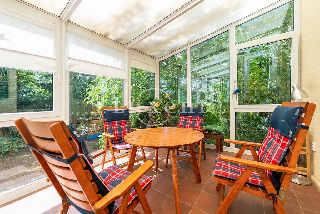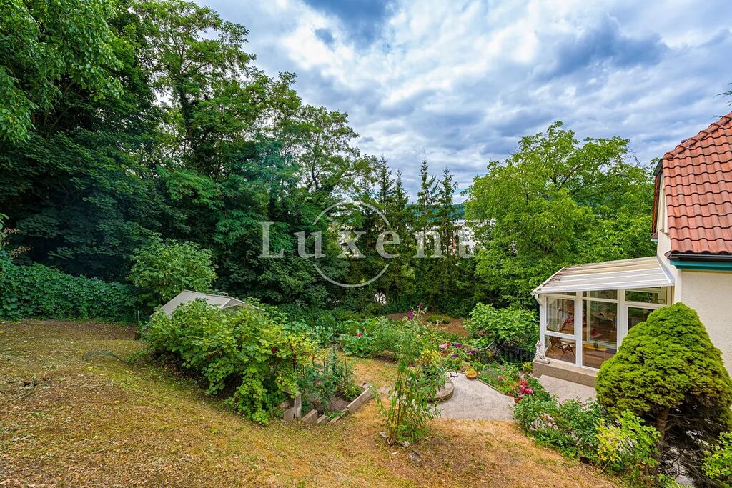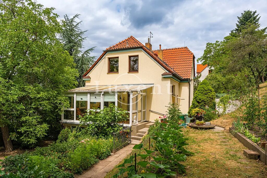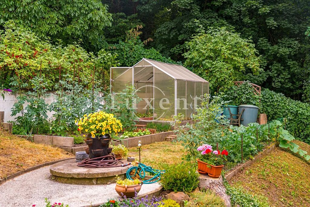 Zahrada je díky svažitému terénu členitě řešená a nabízí řadu příjemných zákoutí. Najdete zde pergolu s posezením, venkovní sklípek, úložný prostor na zahradní náčiní, a také prostor pro pěstování zeleniny, ovoce a květin.