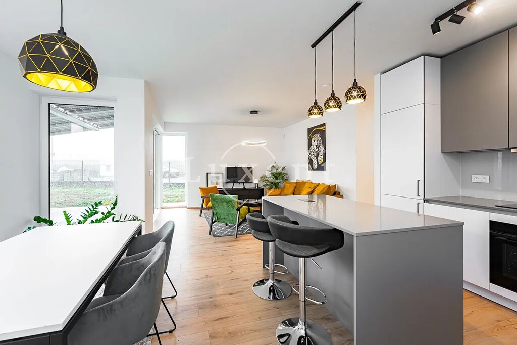 V přízemí domu se nachází předsíň, koupelna, prádelna, tech. místnost a velký obývací pokoj s kuchyňským koutem (42 m2) masivně prosklený do zahrady s terasou. V přízemí domu je také integrovaná garáž. V patře je pak hlavní ložnice s vlastní koupelnou a šatnou, dva pokoje s druhou koupelnou a prostorná úložná komora. Chodba nad schodištěm je prosvětlena světlíkem. Více viz přiložené půdorysy. Na podlahách je kvalitní laminátová plovoucí podlaha (dekor dle domu) a keramická dlažba. Vybavení koupelen: Villeroy & Boch.