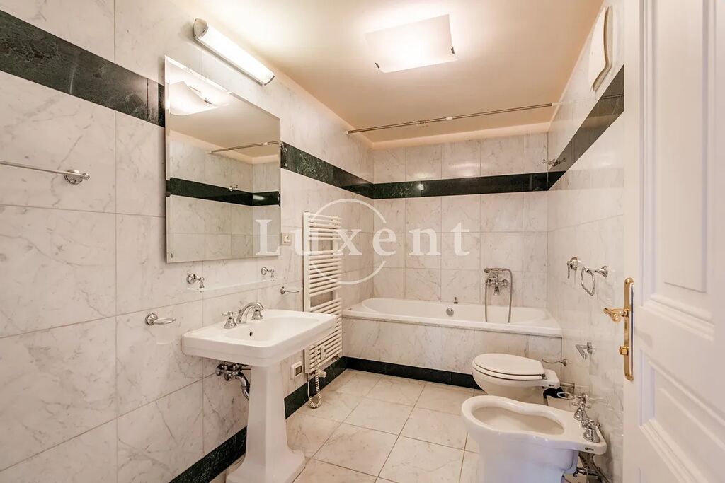 Dispozice bytu zahrnují v přízemí obývací místnost, kuchyň kompletně vybavenou všemi spotřebiči, tři ložnice, z nichž jedna disponuje vlastní šatnou a koupelnou s vanou, bidetem a toaletou, dále koupelnu s toaletou, bidetem a vanou a oddělenou komoru.