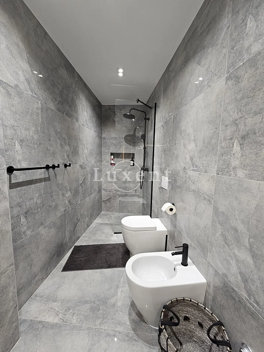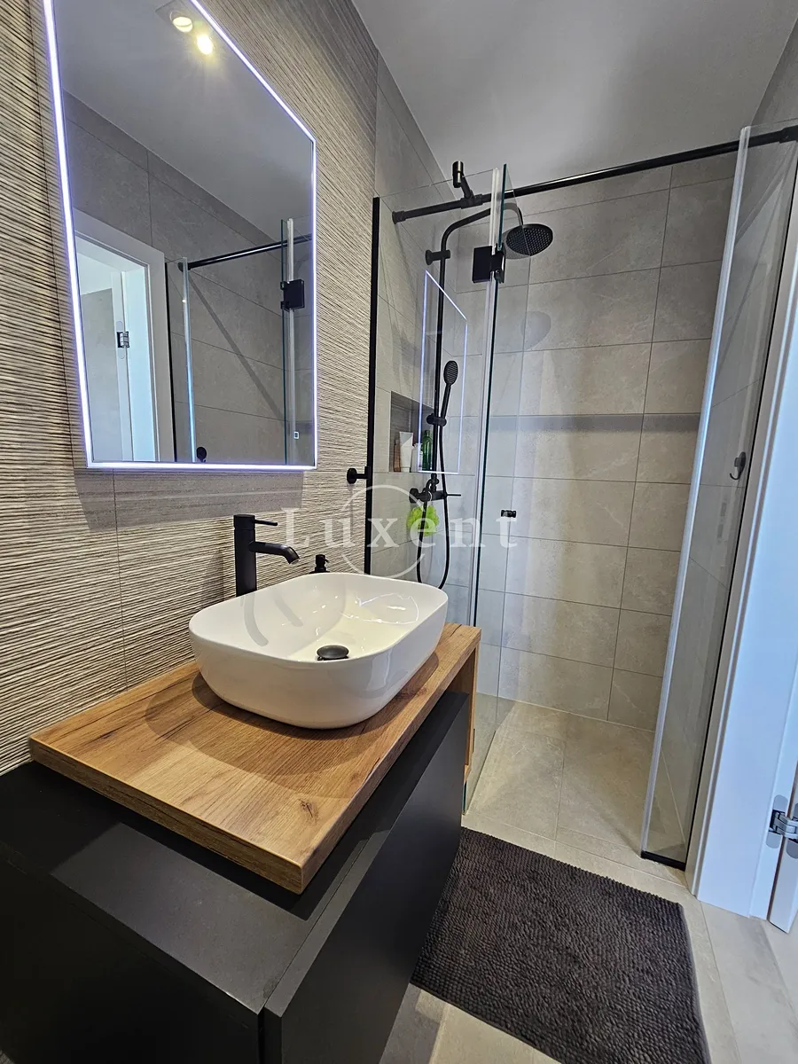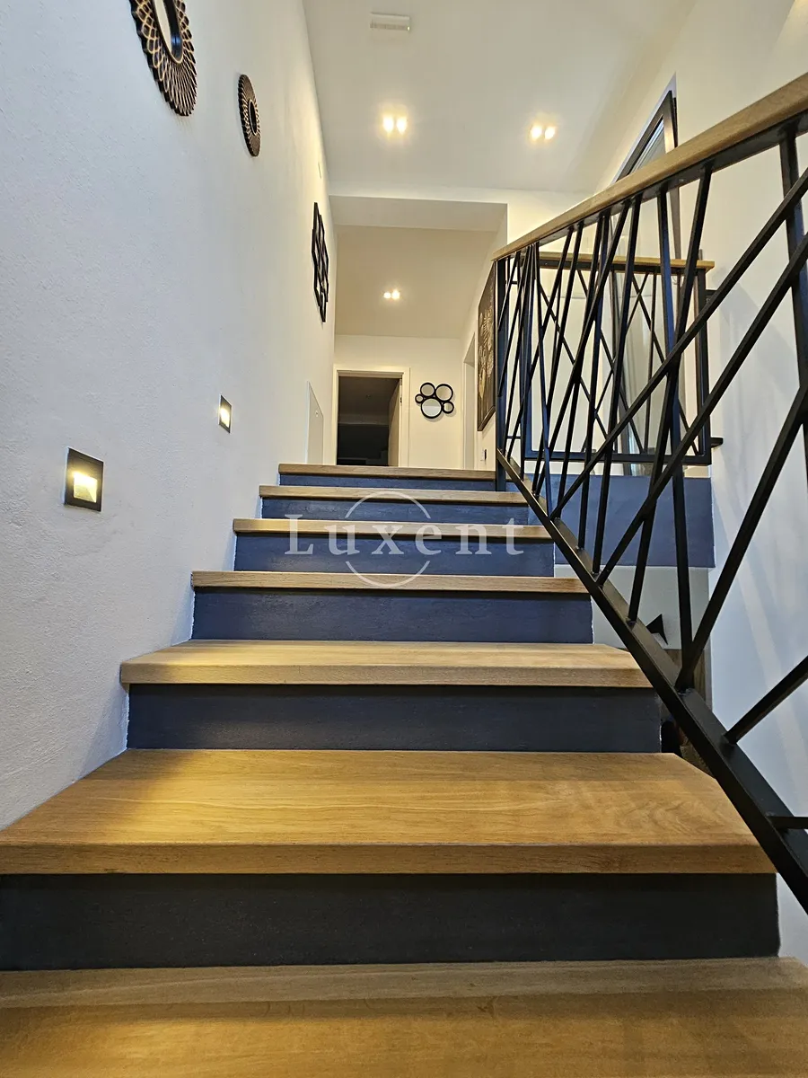 V přízemí se nachází prostorné zádveří, hostinská koupelna, prádelna, moderní kuchyně s jídelní částí a elegantní obývací pokoj, ze kterého je přímý vstup na krytou lodžii s výhledem do zahrady a na bazén. V patře jsou tři ložnice, přičemž hlavní „master“ disponuje vlastní koupelnou, šatnou a terasou. Další dvě ložnice mají vlastní terasy a sdílenou koupelnu. Každý detail interiéru je proveden v nejvyšší kvalitě, s důrazem na moderní design a funkčnost.