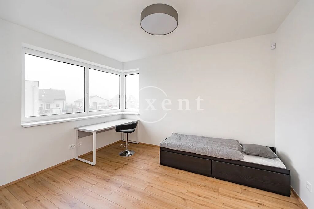 V přízemí domu je předsíň, koupelna, prádelna, tech. místnost a pak obývací pokoj příjemně prosklený do zahrady a na terasu. Je zde též integrovaná garáž s přípravou pro dobíjecí stanici. V patře je pak hlavní ložnice s vlastní koupelnou a šatnou, dva dětské pokoje s druhou koupelnou a úložná komora. Chodba nad schodištěm je prosvětlena světlíkem s přípravou pro el. pohon. Více viz přiložené půdorysy. Na podlahách je kvalitní laminátová plovoucí podlaha (dekor dle domu) a keramická dlažba. Vybavení koupelen: Villeroy & Boch.