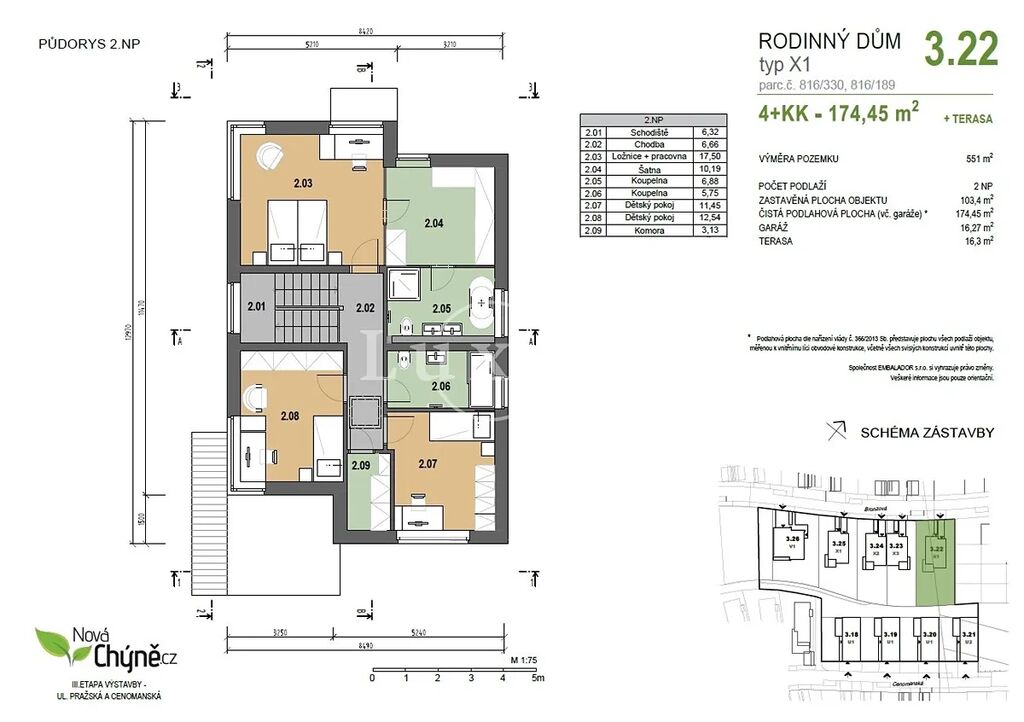 Nabízíme samostatný rodinný dům se zahradou v projektu Nová Chýně, na západním okraji Prahy – ve městě Chýně – s dojezdem 14 km do centra Prahy. Projekt uspokojí lokalitou, kvalitou zděných domů s praktickými dispozicemi a zahradami i technologickou promyšleností. Nabízený rodinný má dispozici 4+kk, podlahovou plochu 174,5 m2, terasu 16,3 m2. Stojí na pozemku o rozloze 551 m2 se zahradou 448 m2. Součástí domu je garáž pro jeden vůz a jedno další park. stání je na vlastním pozemku.