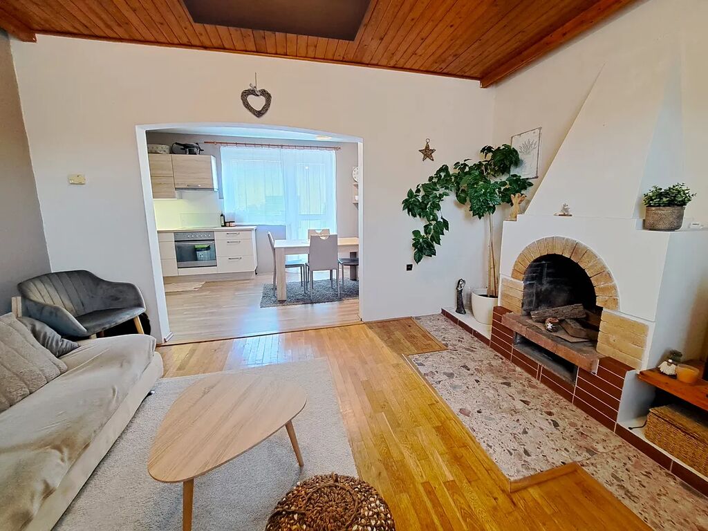 V přízemí se nachází prostorná chodba, koupelna, toaleta, pokoj, obývací pokoj s krbem a kuchyní, která je propojená s východem na terasu a zahradu.