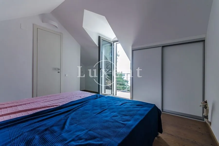 Venkovní schodiště, pod kterým se nachází praktická spíž, vede do prvního patra (vysokého podkroví), kde se nacházejí dvě další ložnice, koupelna a balkon s nerušeným výhledem na moře.