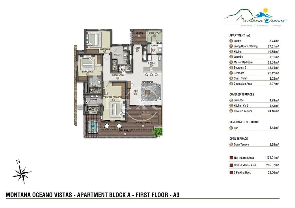 Developerský projekt se skládá z 13 apartmánů a 4 soukromých vil a stojí na dvou pozemcích blízko u sebe: Montana Oceano Apartments o třech blocích čítá celkem 3 luxusní penthousy a 10 moderních apartmánů, všechny mají rozsáhlé terasy s panoramatickými výhledy do okolí, promyšlenou ventilaci a dostatek slunce. Nespornou předností projektu je promyšlený venkovní prostor – součástí strážené soukromé rezidence je bazén, zahrada, fitness a dětské hřiště. Všechny objekty mají zajištěné parkování pro dvě vozidla.