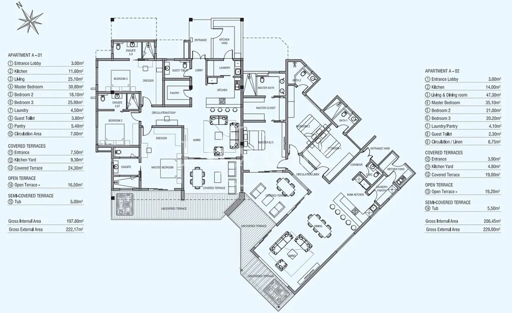 Dispozice bytu o obytné ploše 154 m2 zahrnuje tři ložnice s vlastními koupelnami (35 m2, 21 m2, 20 m2), obývací pokoj (47 m2) s kuchyní (14 m2) s velkými arkýřovými okny, skrze které se dostanete na prostornou terasu (44 m2), která je z části zastřešená. Součástí bytu je také prádelna (4 m2), toaleta pro hosty (2 m2), kuchyňský dvorek (5 m2), chodba (7 m2) a vstupní hala (3 m2). K tomuto apartmánu také patří vlastní zahrada (24 m2) a dvě parkovací stání.