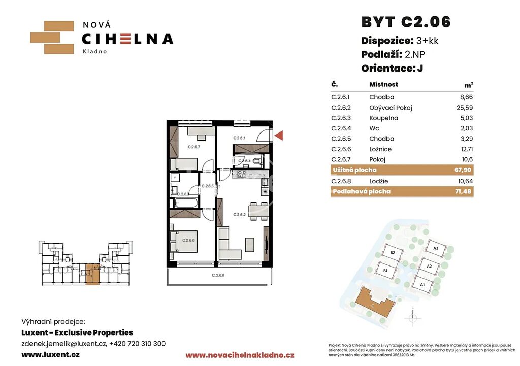 Nabízíme k prodeji byt 3+kk o podlahové ploše 71,48 m² s lodžií 10,64 m² v mimořádně úsporném developerském projektu Nová Cihelna Kladno vznikajícím v městské čtvrti Kladno – Rozdělov.