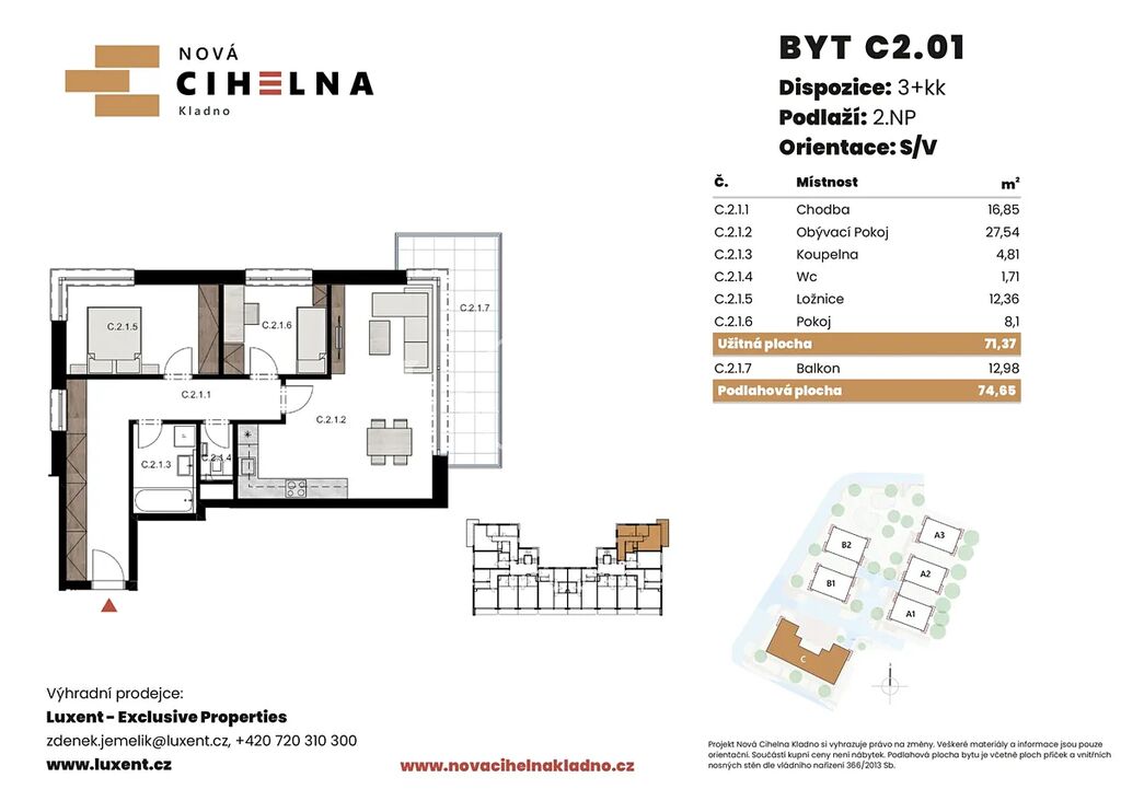 Nabízíme k prodeji byt 3+kk o podlahové ploše 74,65 m² s balkonem 12,98 m² v mimořádně úsporném developerském projektu Nová Cihelna Kladno vznikajícím v městské čtvrti Kladno – Rozdělov.