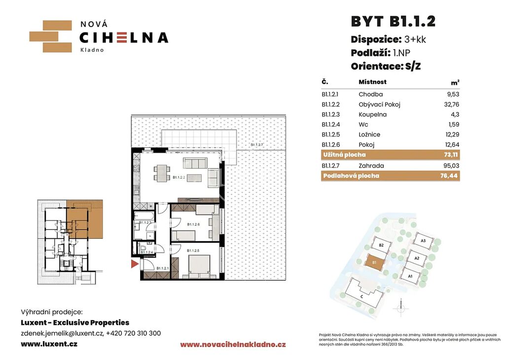 Nabízíme k prodeji byt 3+kk o podlahové ploše 76,44 m² se zahradou 95,03 m² v mimořádně úsporném developerském projektu Nová Cihelna Kladno vznikajícím v městské čtvrti Kladno – Rozdělov.